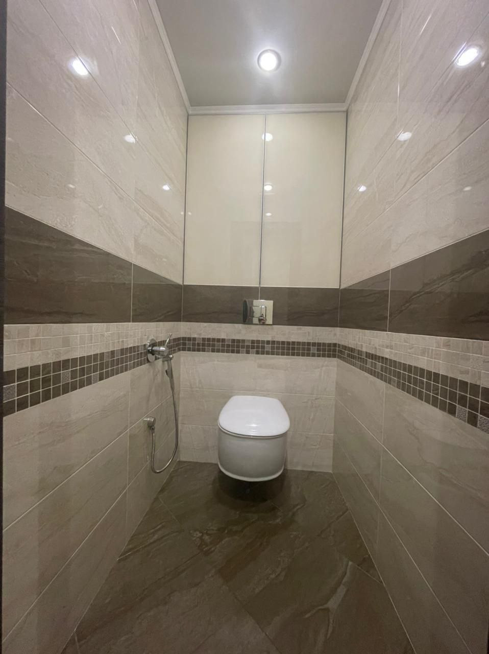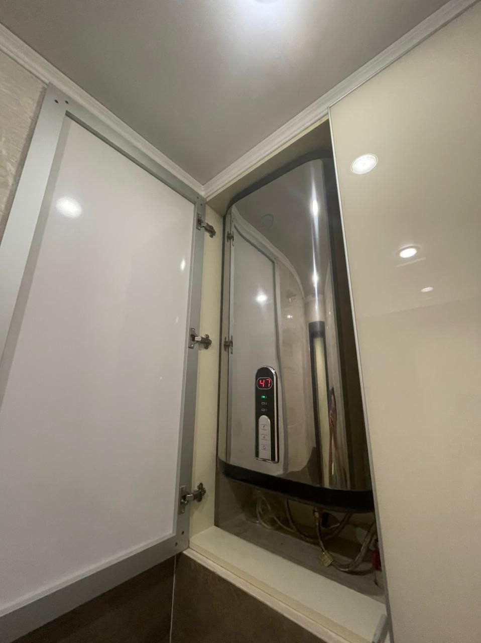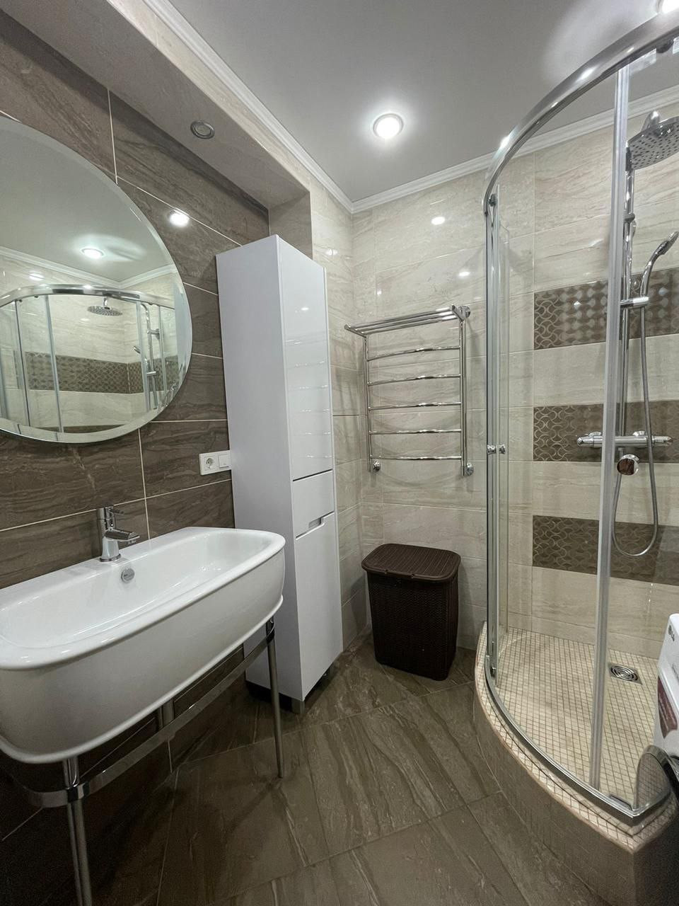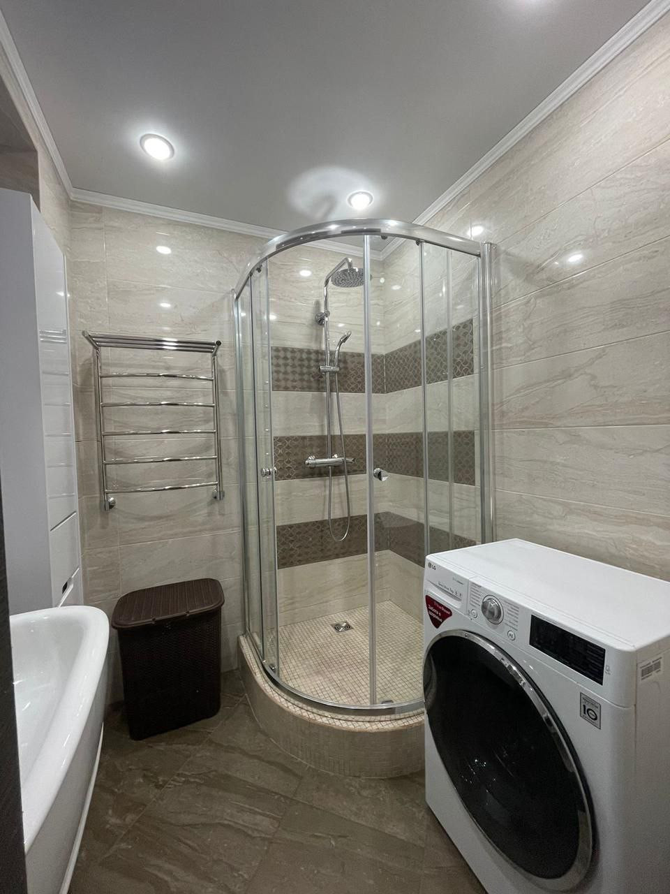 - в ванной комнате отдельная душевая кабина с тропическим душем, унитаз с инсталляцией, гигиенический душ, водонагреватель, стиральная машина и зеркало с подсветкой;