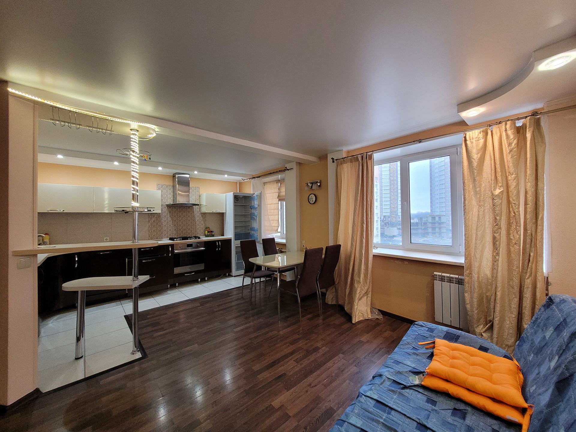 Светлая кухня-гостиная оснащена современным гарнитуром и встроенной бытовой техникой (холодильник, варочная панель, вытяжка, посудомоечная машина). Вся мебель и техника остаются при продаже. Комнаты изолированные. Санузел раздельный, в кафеле, ванная комната просторная и приятная.