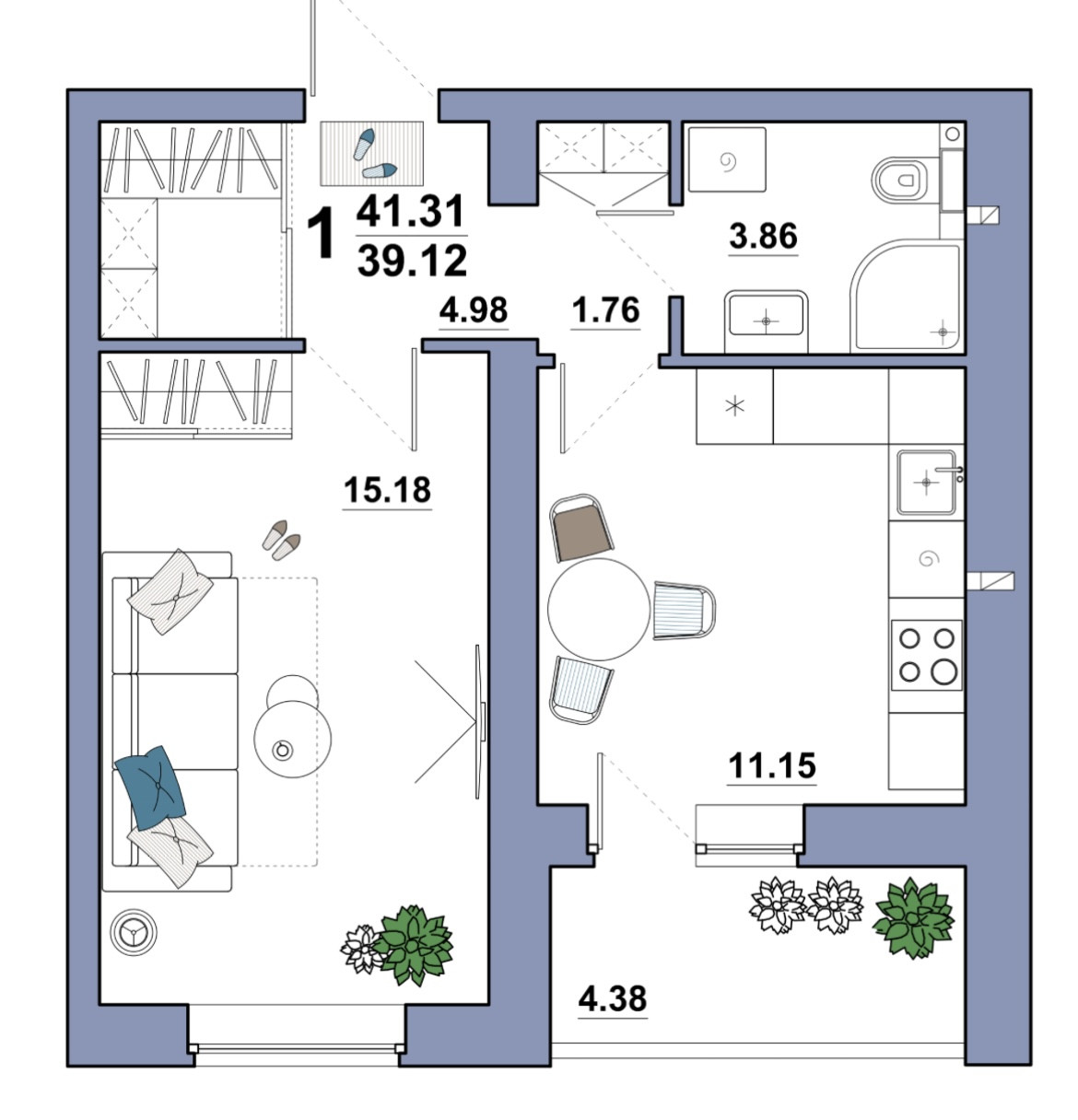 Общая площадь 41.3 м2