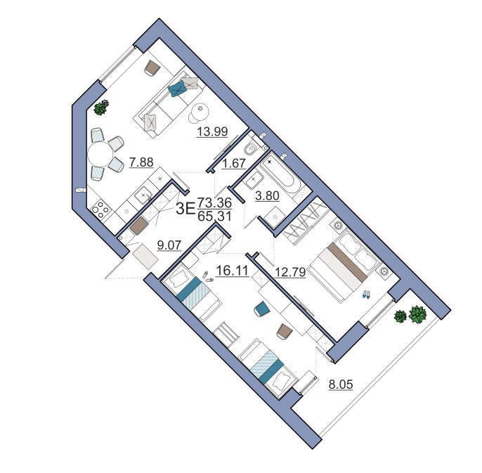 - 7,9 кухонная зона + 13,99 зона гостинной