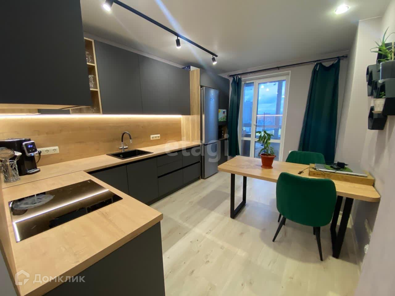 Кухня-гостиная со встроенным духовым шкафом и варочной индукционной поверхностью.