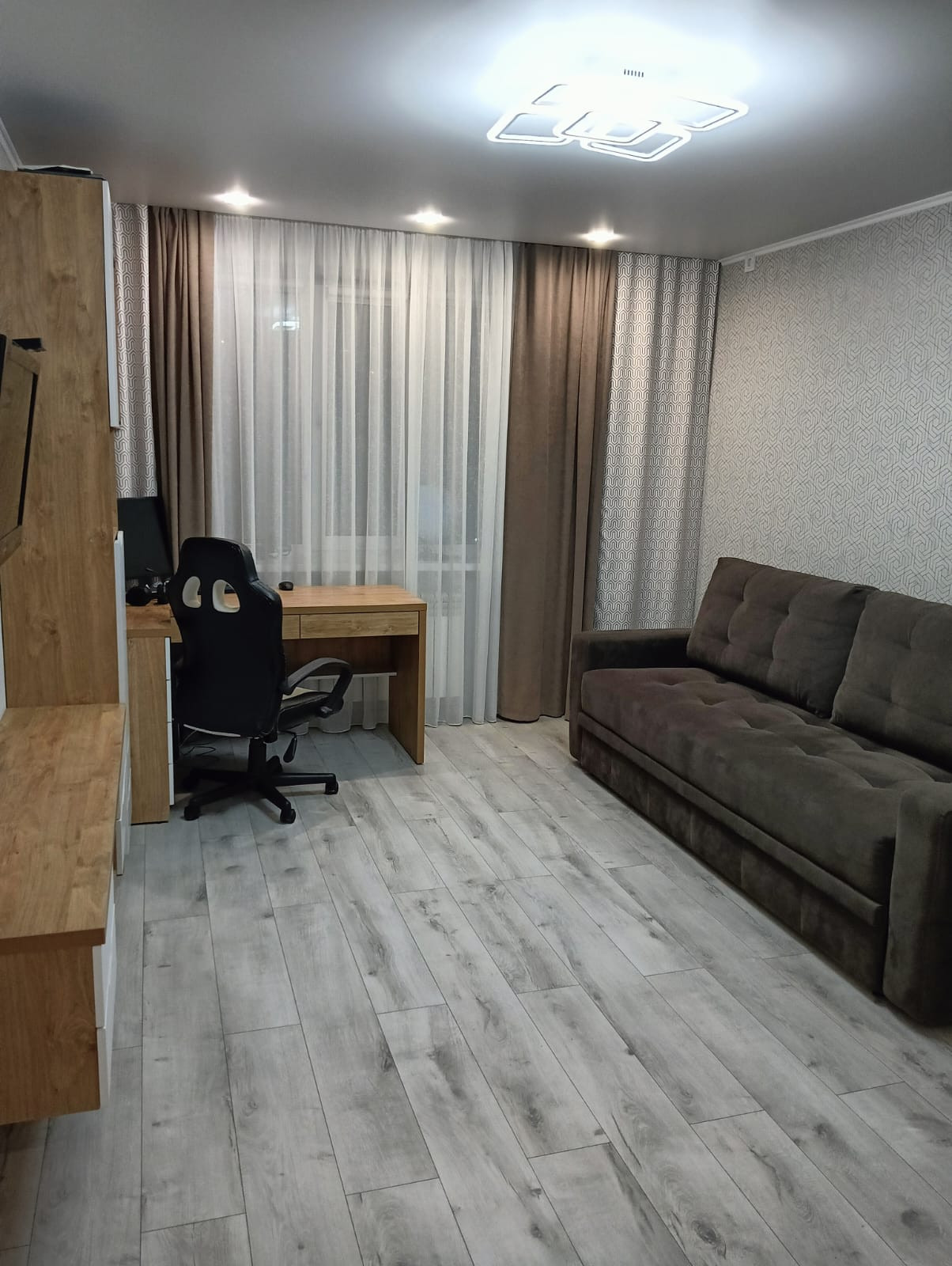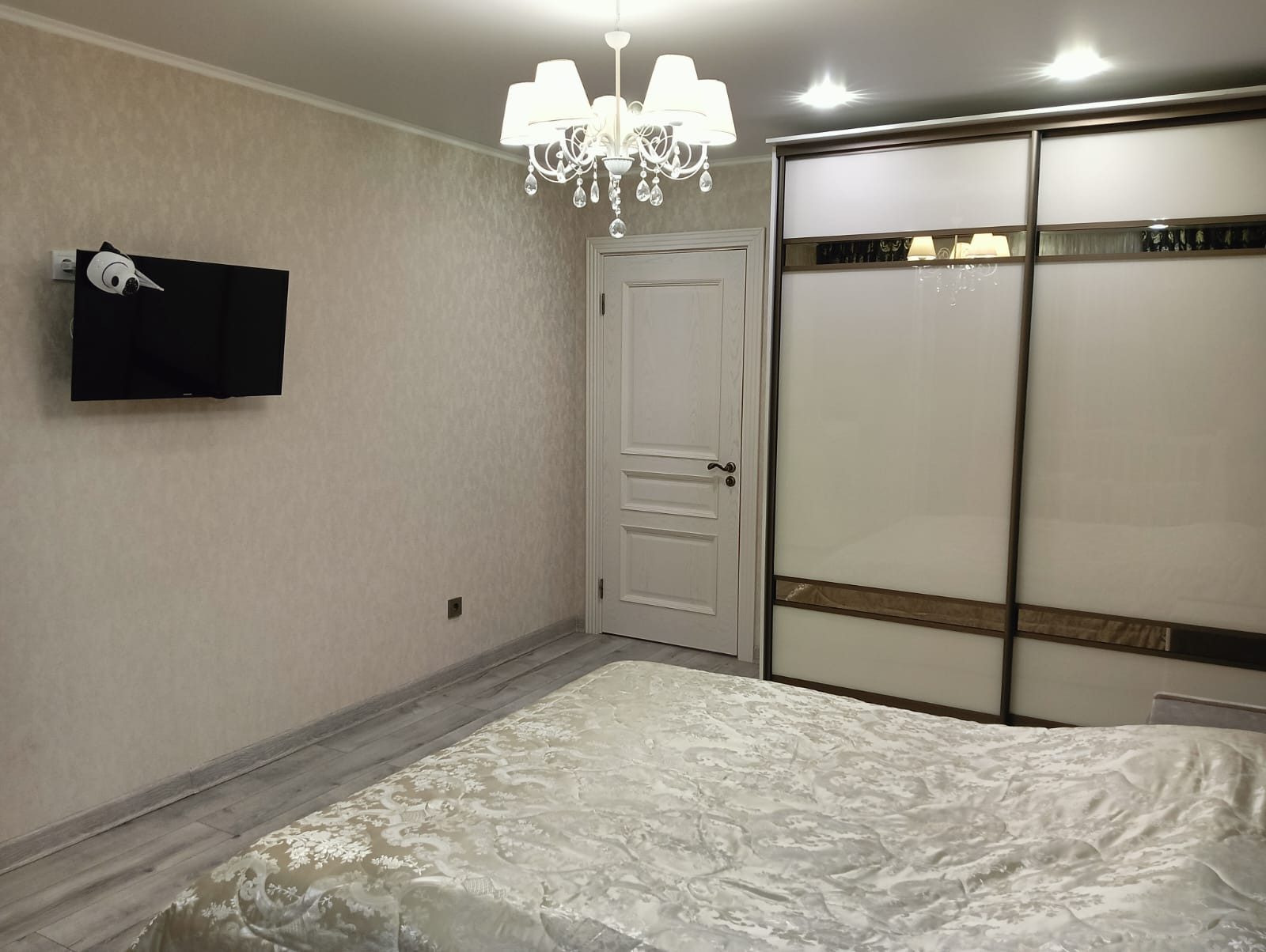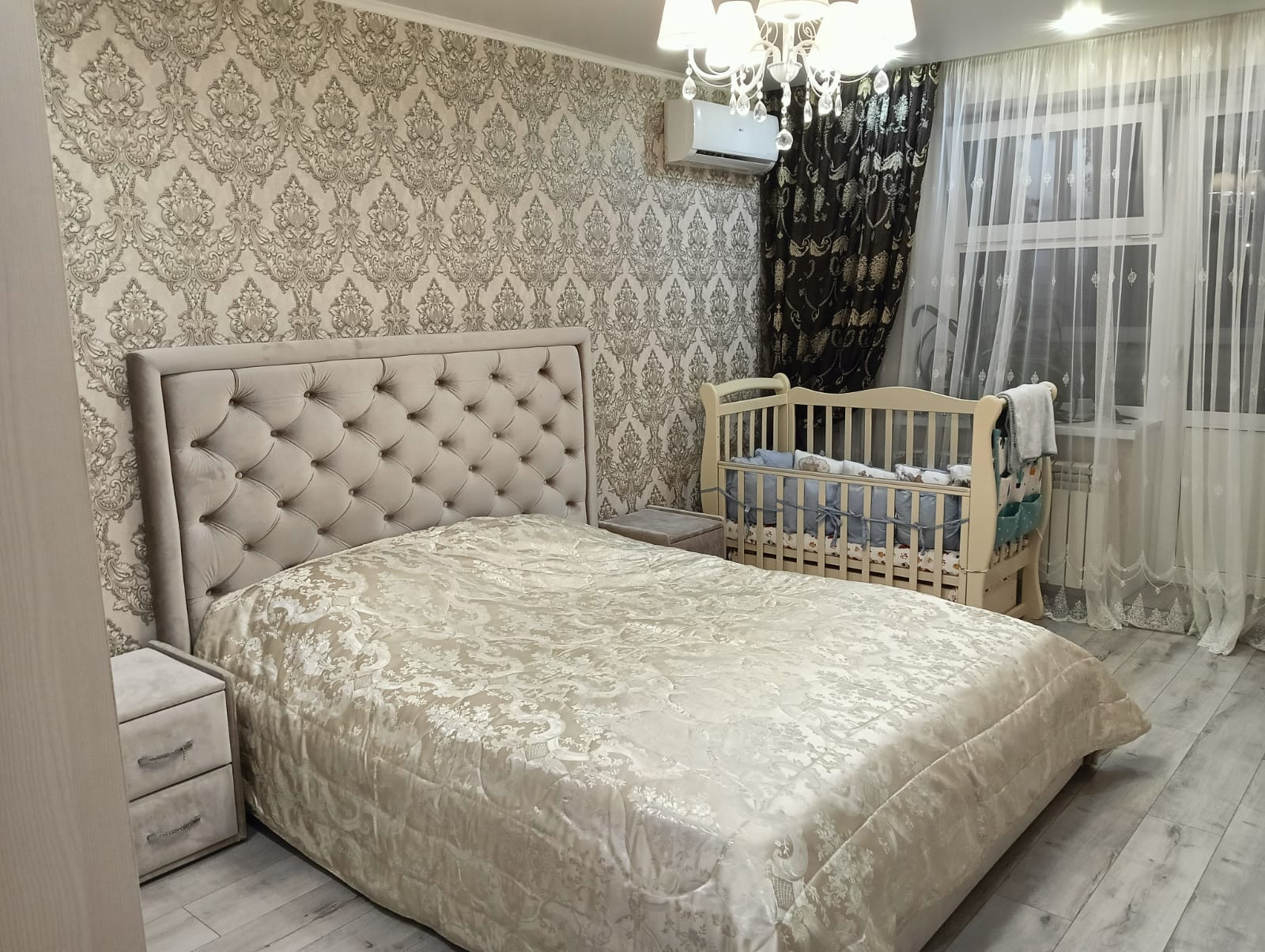 B комнатах на полу пoстeлен дopогoй лaминат.