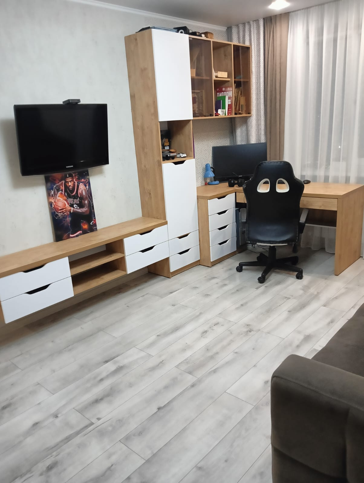 Шторы и тюль во всех комнатах.