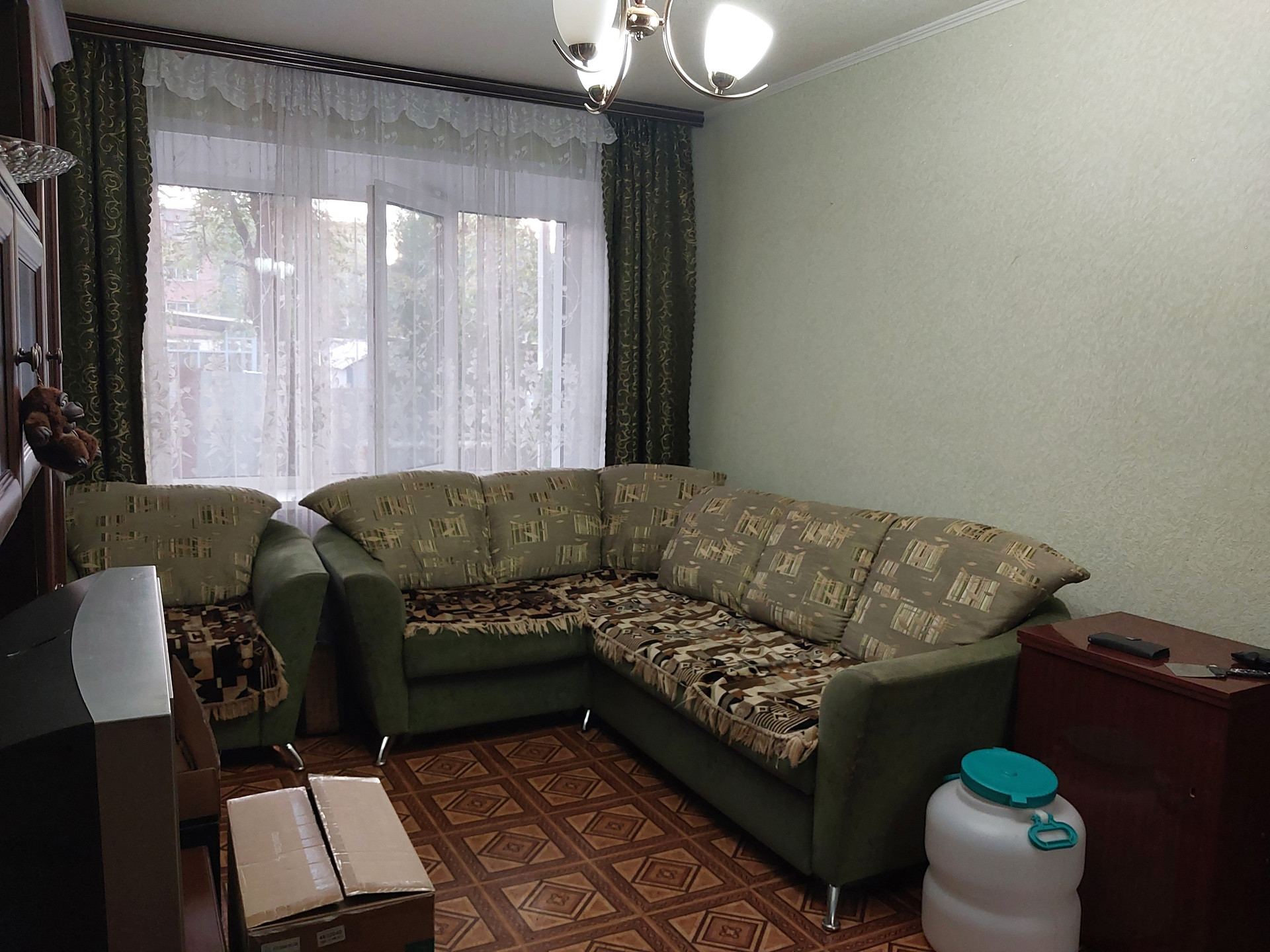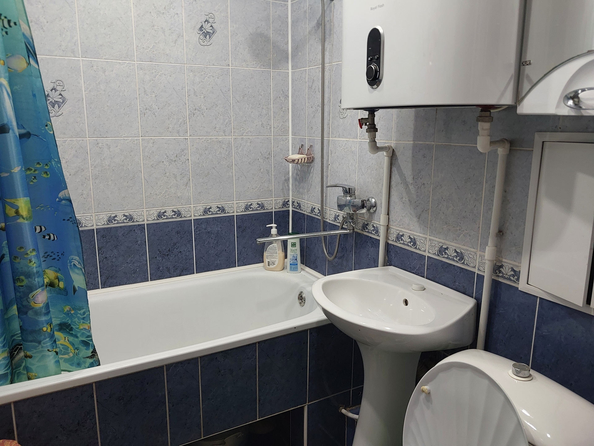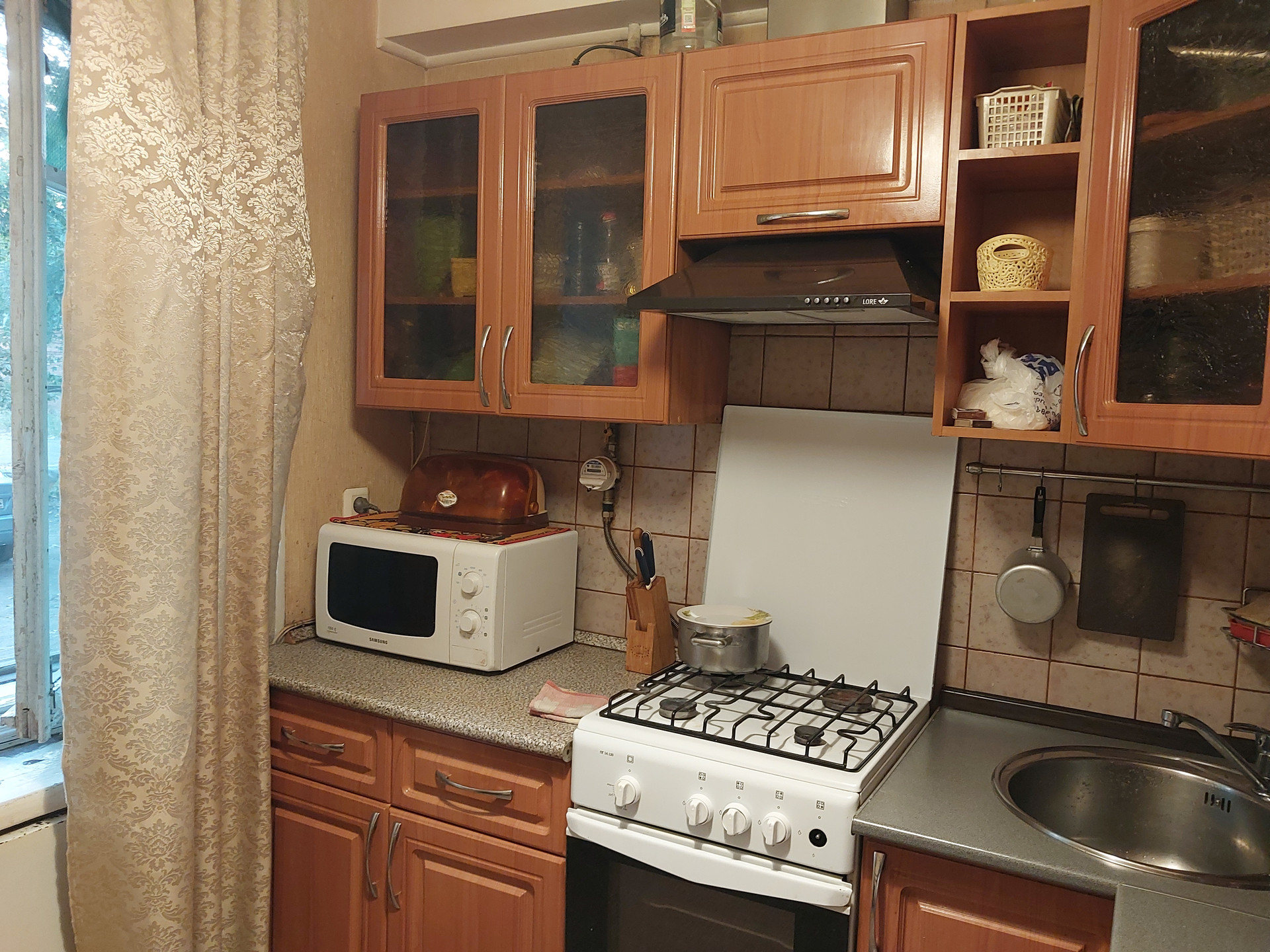 При продаже остается кухонный гарнитур и водонагреватель в ванной.