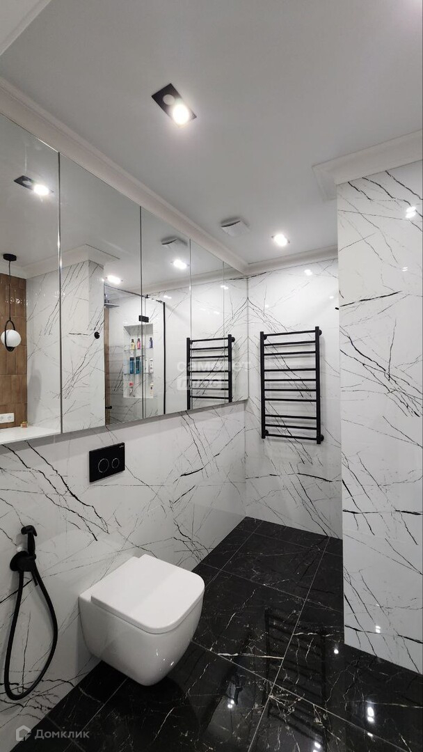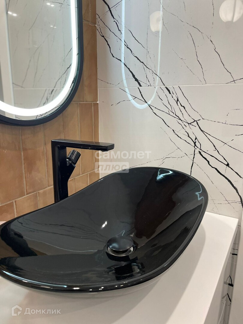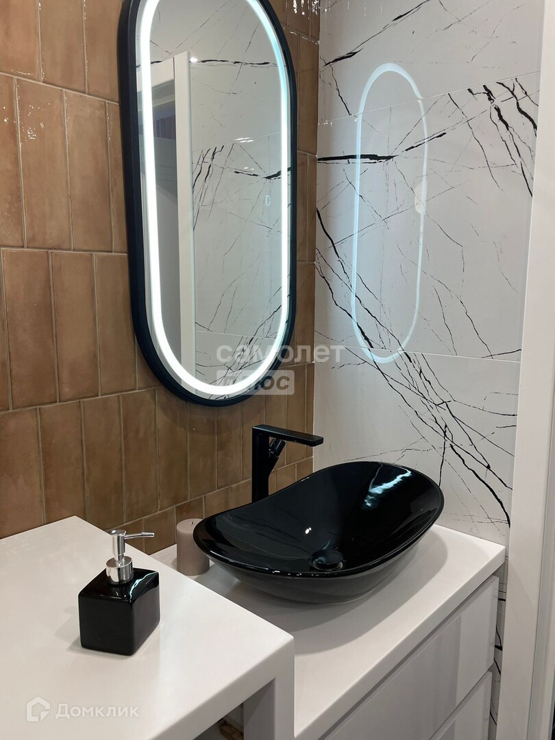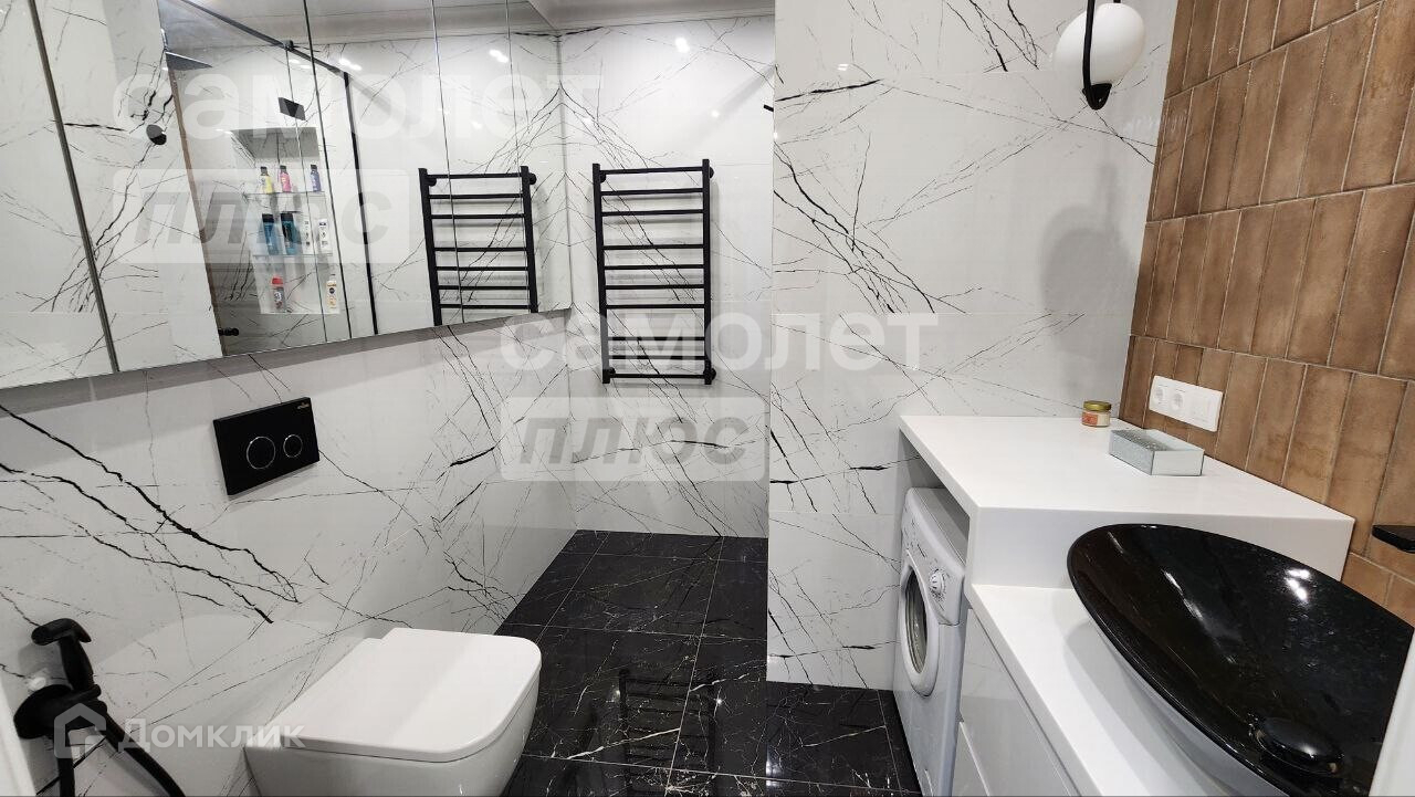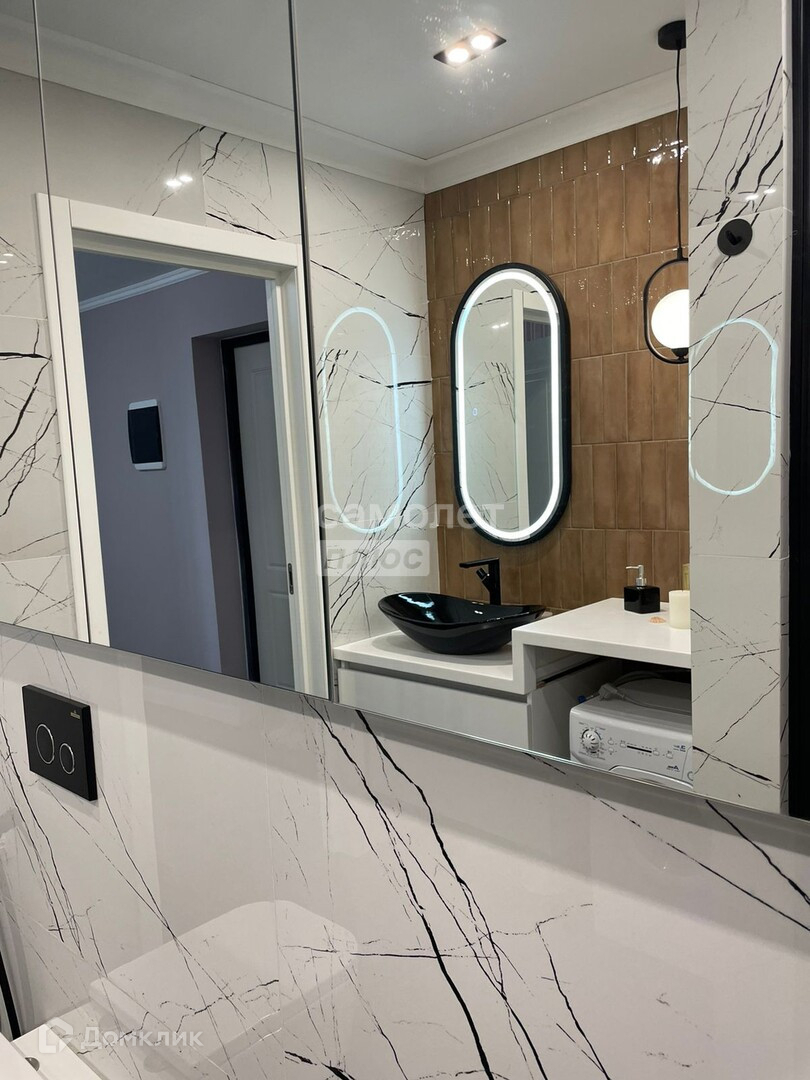 Совмещённый санузел (6 кв.м.). Электрополотенцесушитель скрытого монтажа. Проточный водонагреватель Electrolux. Каменная столешница с отведённым местом и подводом коммуникаций для стиральной машины. Продуманная система хранения с зеркальными фасадами над инсталляцией с возможностью хранения необходимых вещей и скрытой розеткой (для подзарядки бытовых приборов).