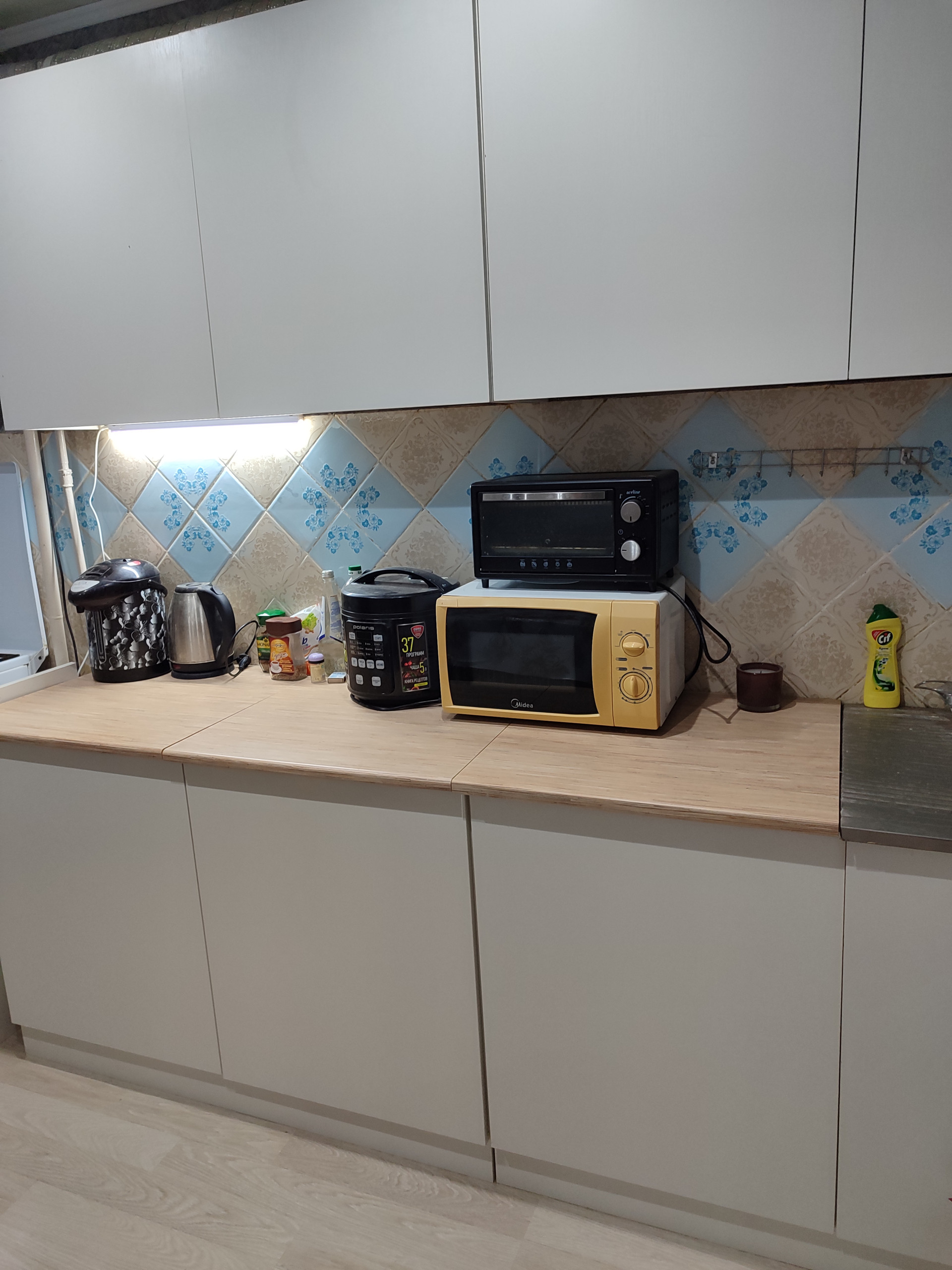В самой квартире окна заменяны,во всей квартире ламинат включая балкон,в квартире был выполнен косметический ремонт,все счётчики заменяны,на кухне новый холодильник и стиральная машина ( техника была куплена в магазине меньше года назад ),также есть электрочайник, микроволновая печь,мультиварка,в комнате новый телевизор,всё это останется новому владельцу квартиры + посуда.