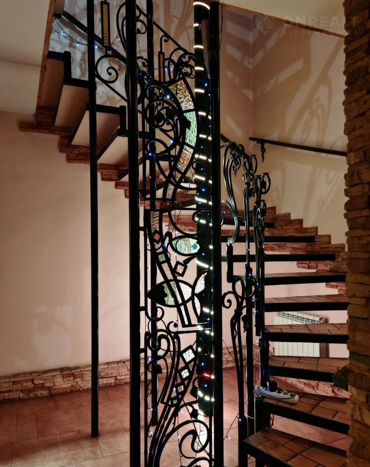 на полу плитка, потолочные деревянные балки, декоративный кирпич, художественная роспись стен, кованная металлическая лестница.