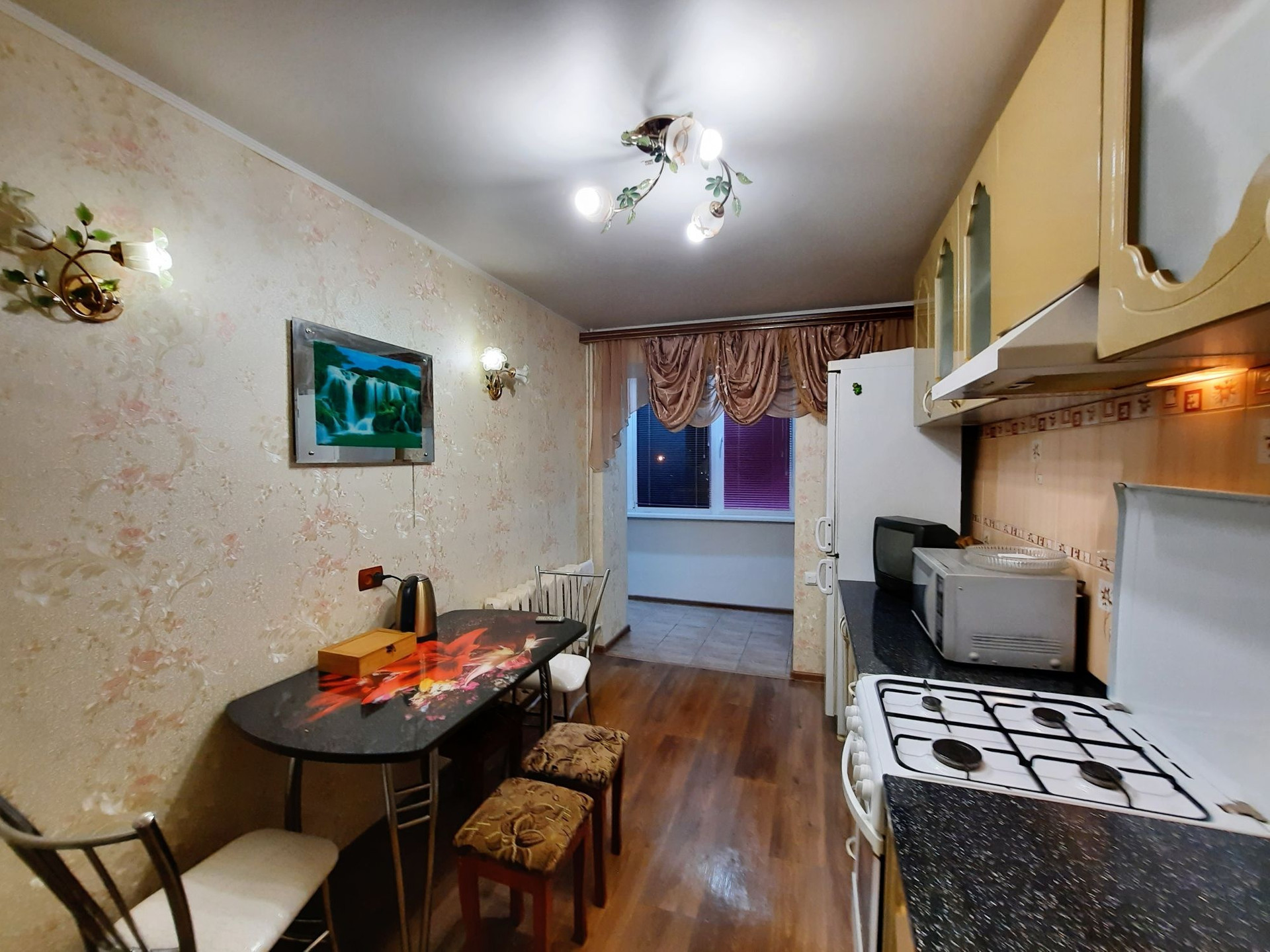 Квартира теплая, светлая и уютная, хорошо мебелирована, есть всё необходимое из техники . Сделан ремонт. Окна выходят во двор, лоджия утеплена и совмещена с кухней.
