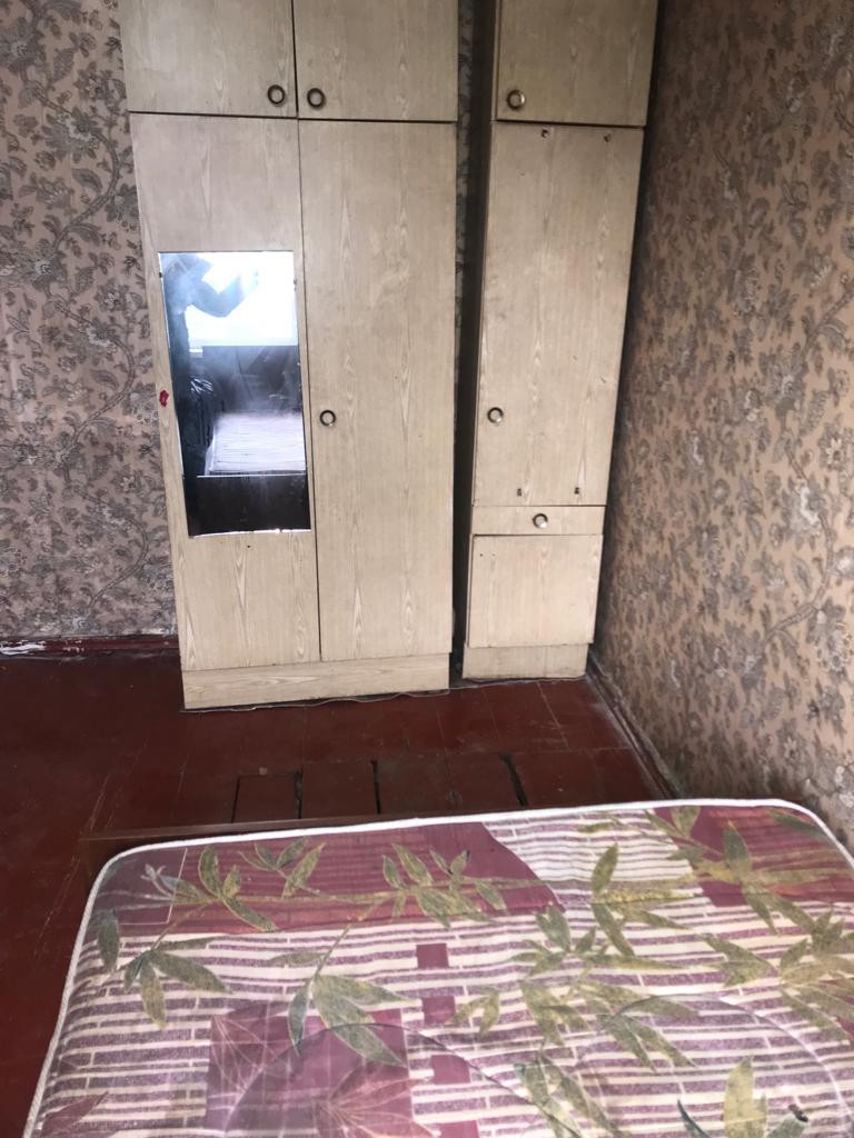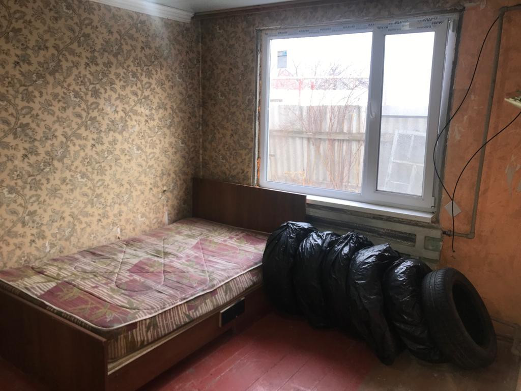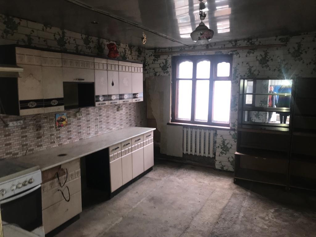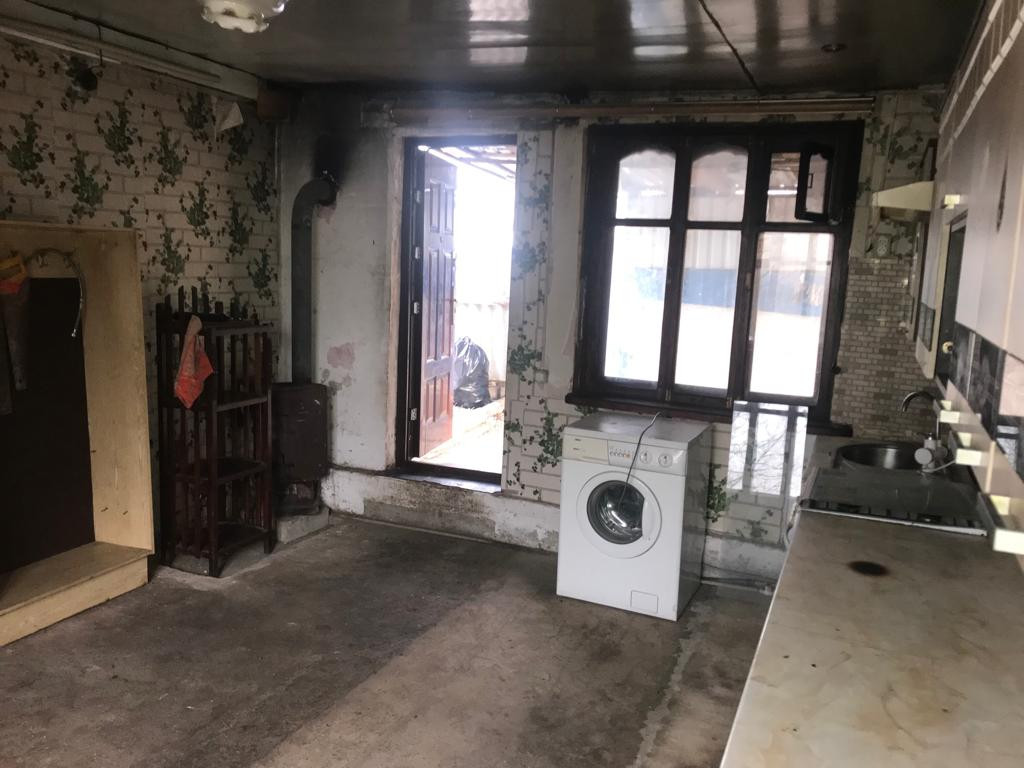 Одна комната, просторная кухня. Пристроили санузел, подвал, баня.