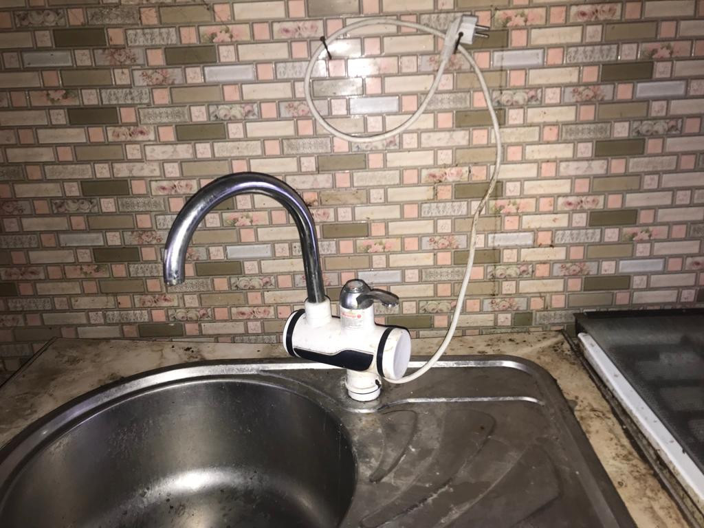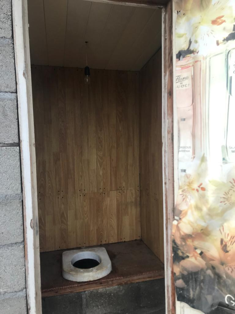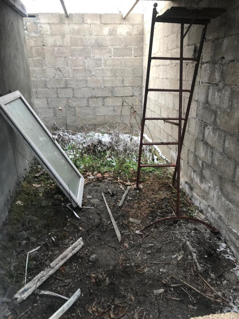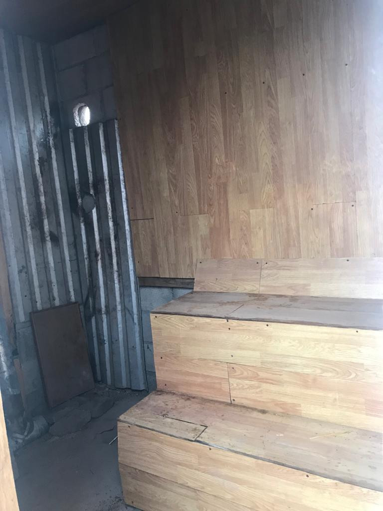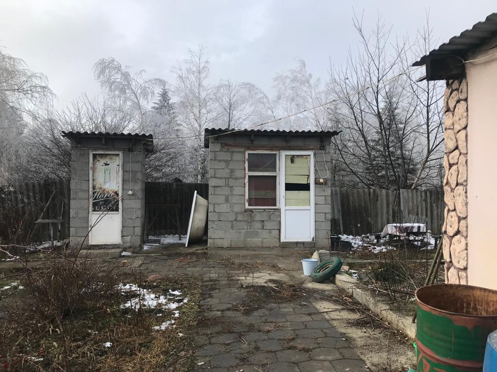 Одна комната, просторная кухня. Пристроили санузел, подвал, баня.