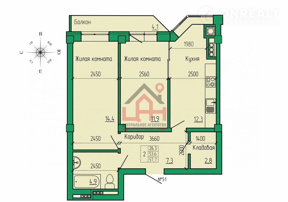 Общая площадь 57.7 м2