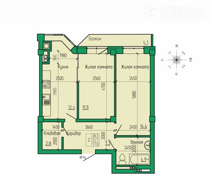 Общая площадь 57.8 м2