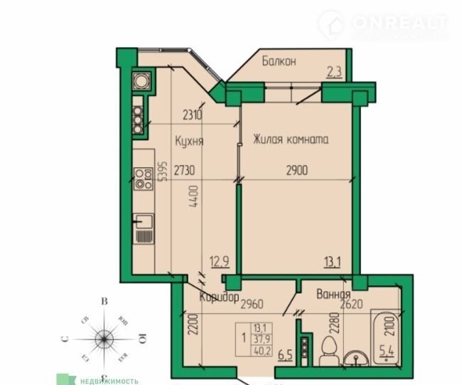 Общая площадь 40.2 м2