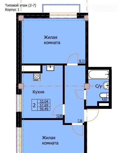 общая площадь 59,49 м2; жилая 33,04 м2; кухня 12,66 м2; санузел 4,63 м2;