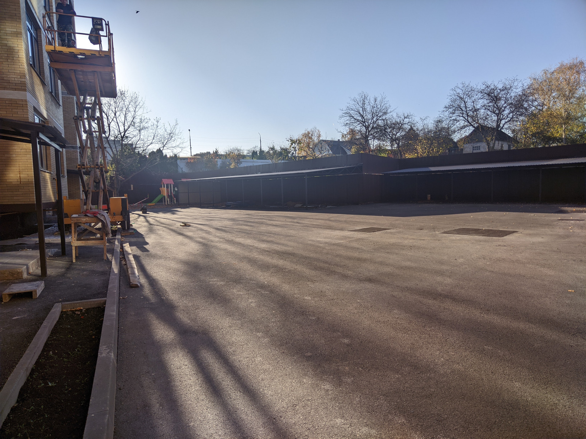 Закрытая и благоустроенная территория с парковочными местами и зоной отдыха.