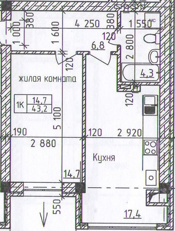 Общая площадь 43.6 м2