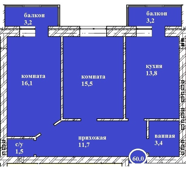 Общая площадь 60 м2