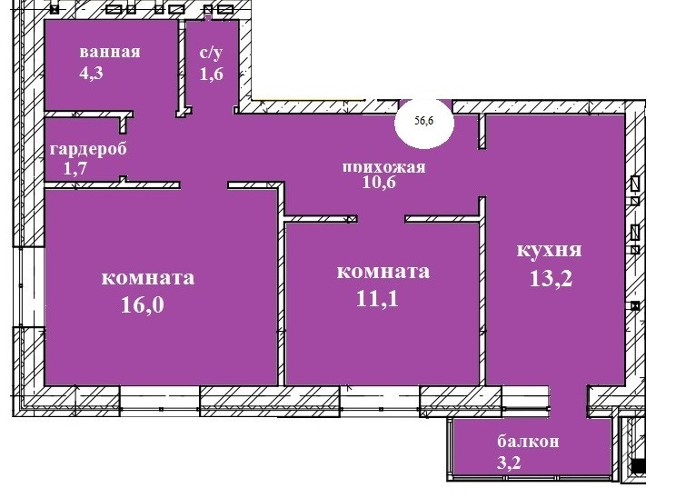 Общая площадь 56.5 м2