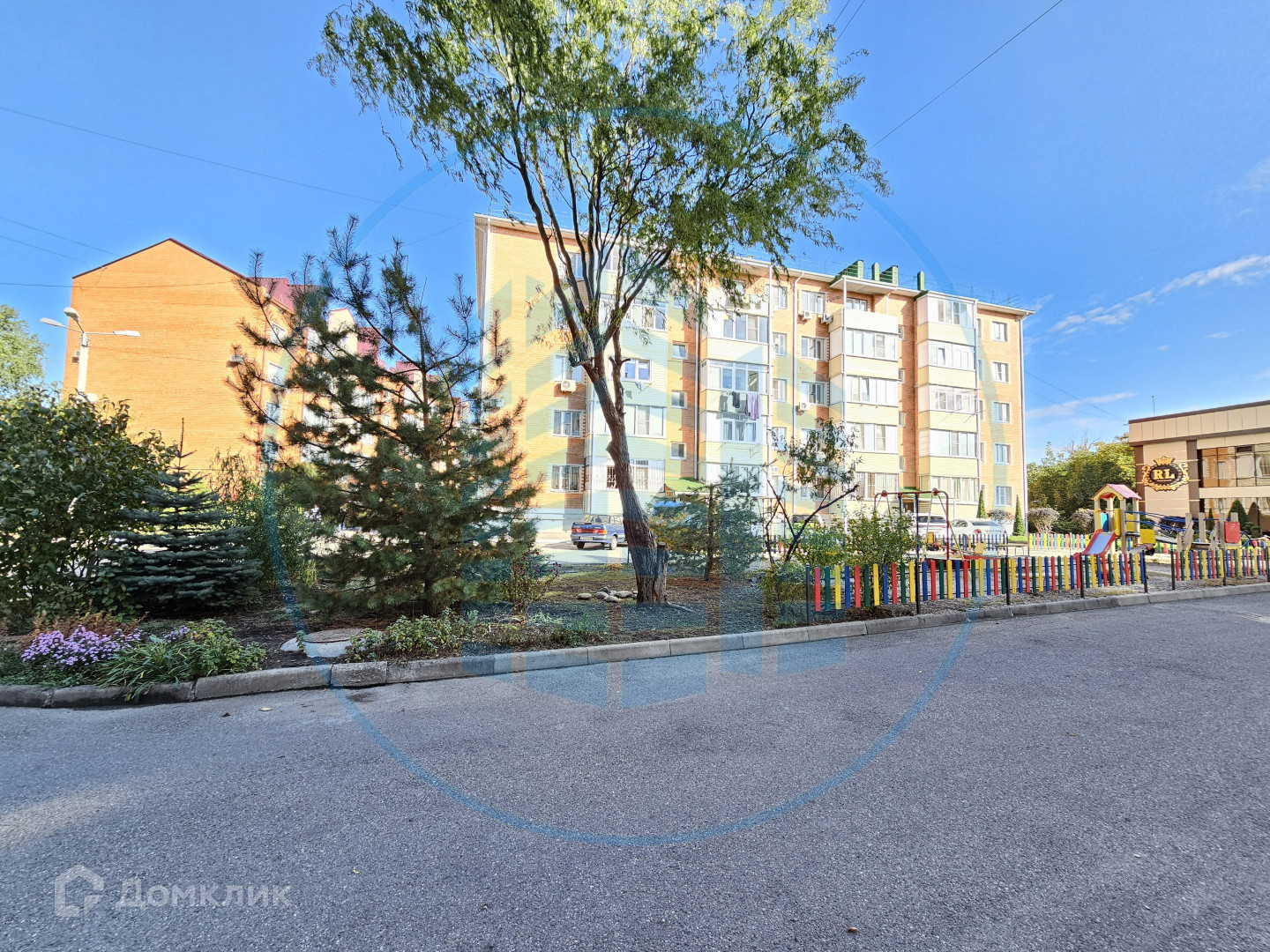 Кирпичный дом. Благоустроенная территория. Места для парковки, детские площадки, зона для отдыха.