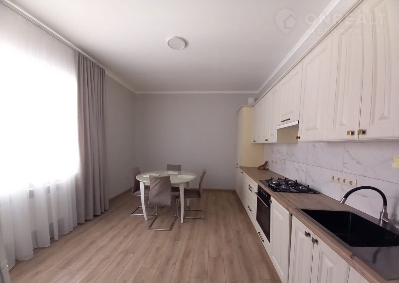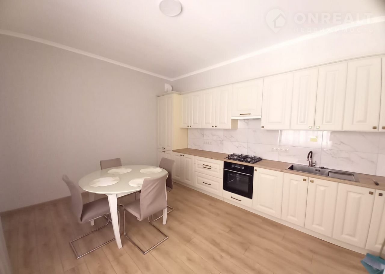 Устaновлeн куxoнный гарнитур.(плита, xoлодильник, посудaмoйкa...)