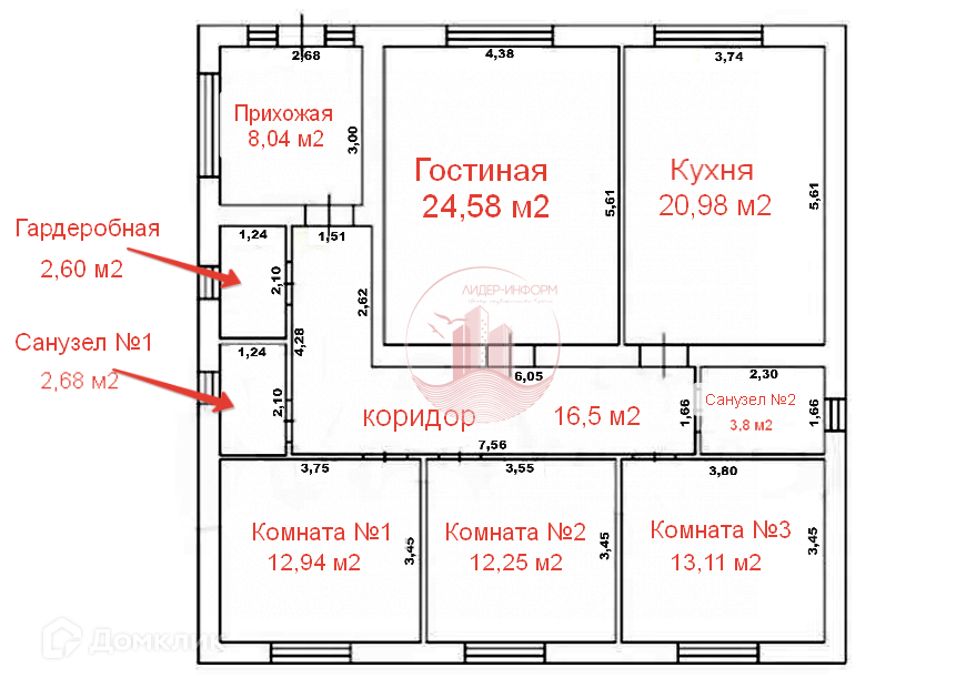 3 спальни12,94 + 12,25 + 13,11 (м2)