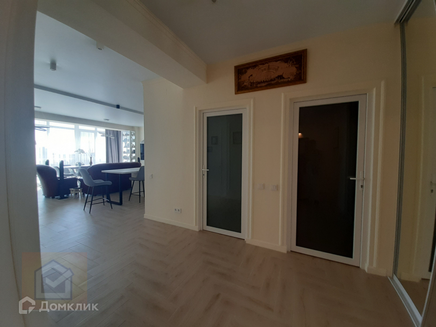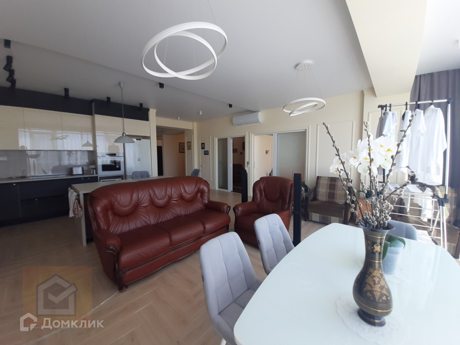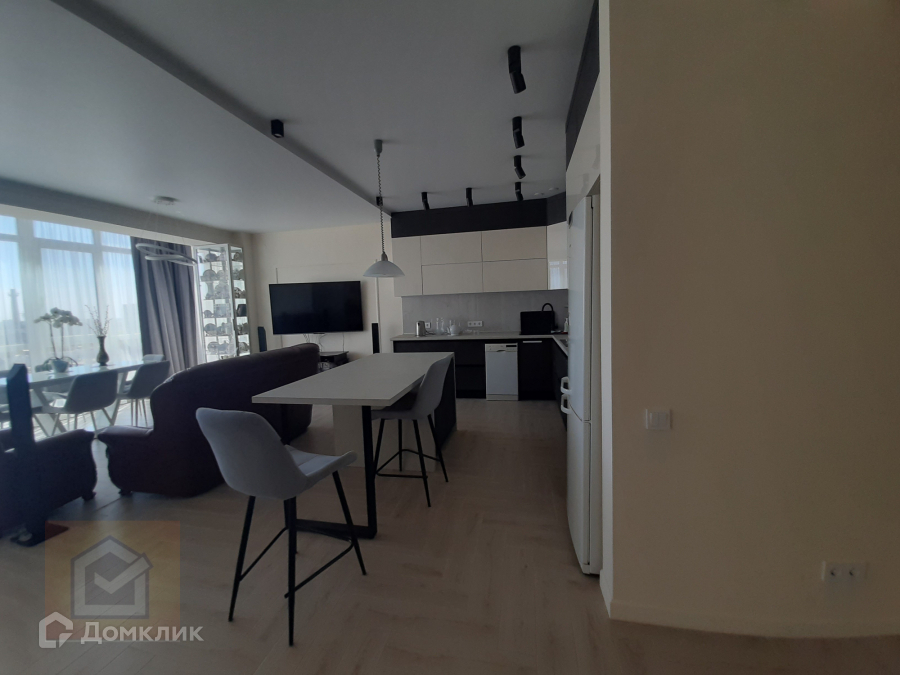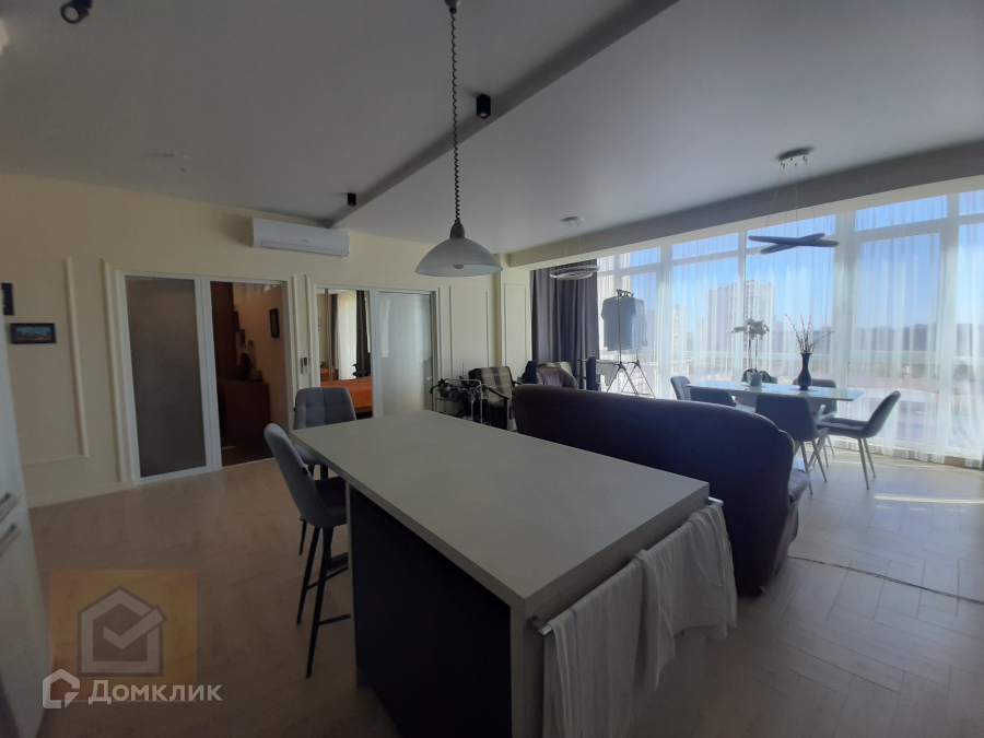 Интересная планировка квартиры в которой большая кухня-гостиная с большими панорамными окнами.