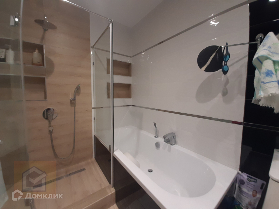 Большая ванная комната в которой есть душевая кабина и ванна.