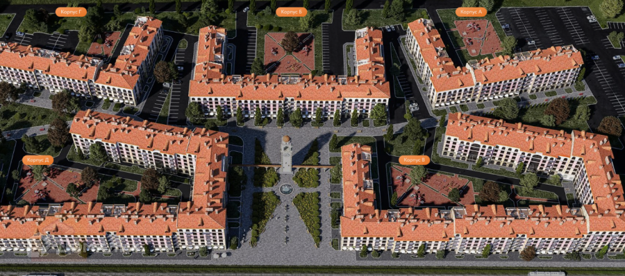 Архитектура жилого комплекса выполнена в классическом итальянском стиле. На территории имеются пешеходные улицы, деревья, газоны, цветочные клумбы, кафе, магазины, детские площадки, парковочные места.