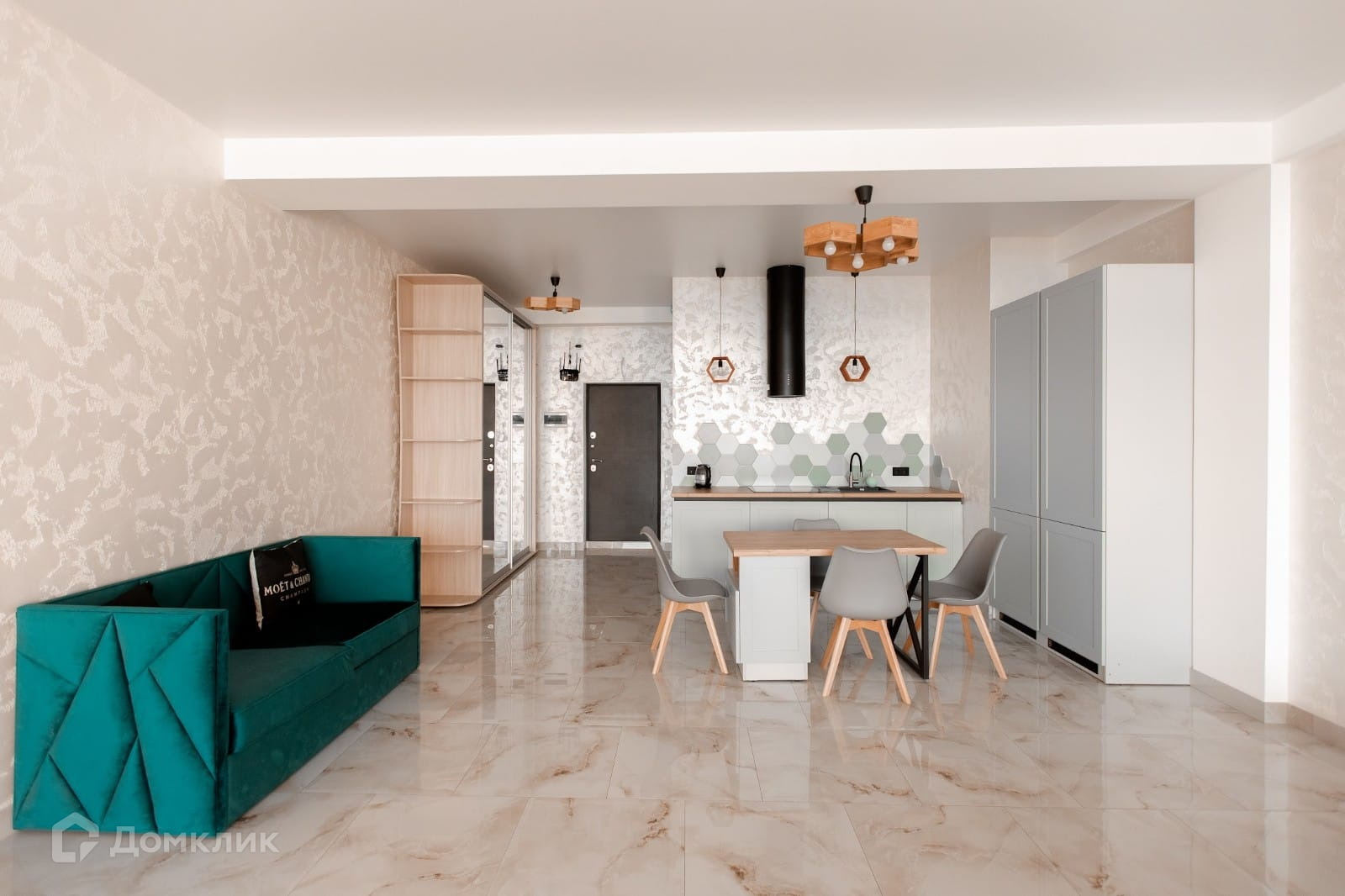 Стены шёлковая фактурная штукатурка. Натяжные сатиновые потолки по всей квартире.