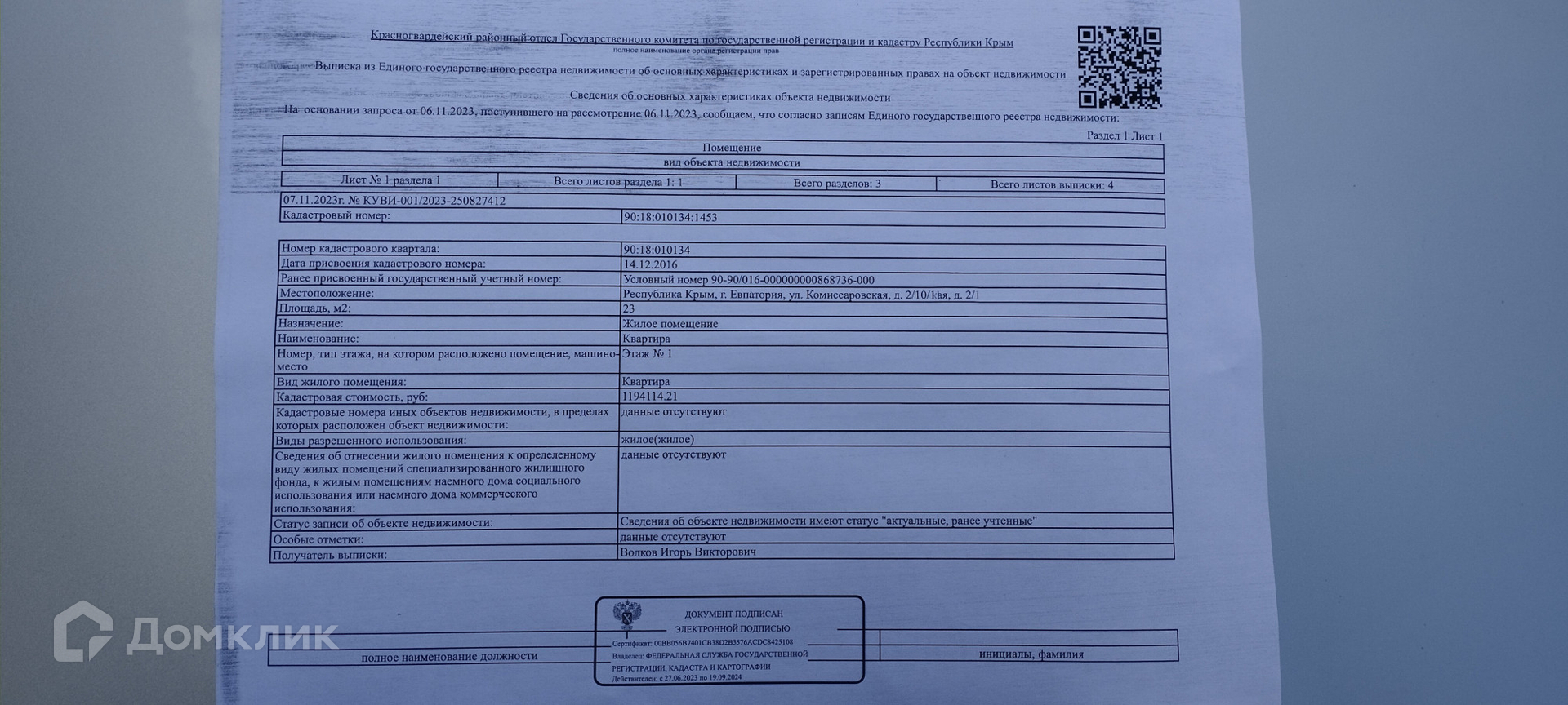 1-комнатная квартира, 23 м2, этаж 1 / 1, на продажу в Евпатории, Комиссаровская улица, 2/10