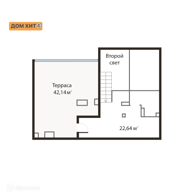 Планировка квартиры продумана до мелочей: на первом уровне расположены просторная гостиная, кухня с выходом на балкон, где вы сможете наслаждаться утренним кофе. Там же находится совмещенный санузел. Удобная лестница ведет на второй уровень, где находится уютная зона отдыха с огромной террасой в 42 м² и прекрасным видом на зеленые насаждения двора.