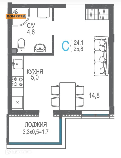 Общая площадь 27.4 м2