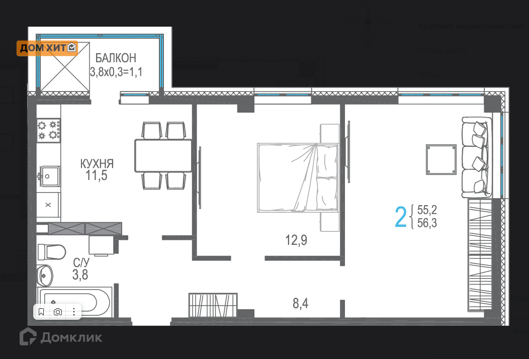 Общая площадь 58.7 м2