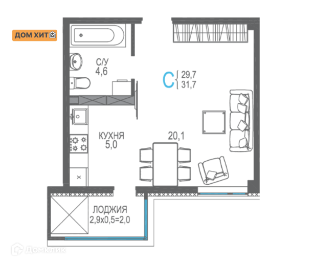 Общая площадь 31.7 м2