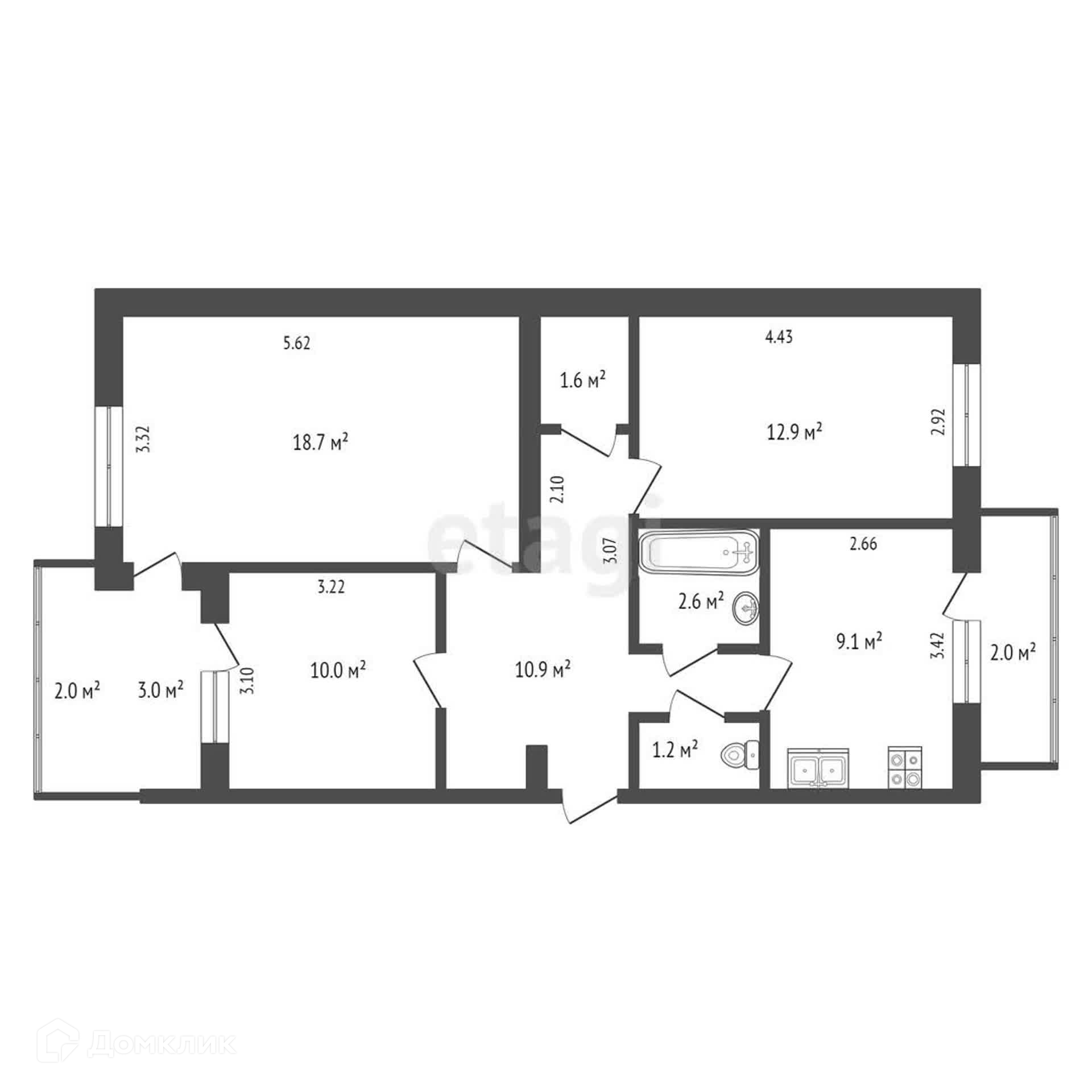 Санузел раздельный: туалет -1.2кв. м / ванная комната 2.6 кв. м.