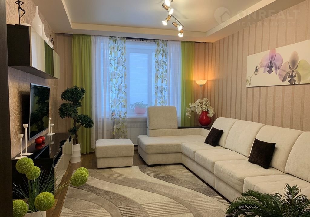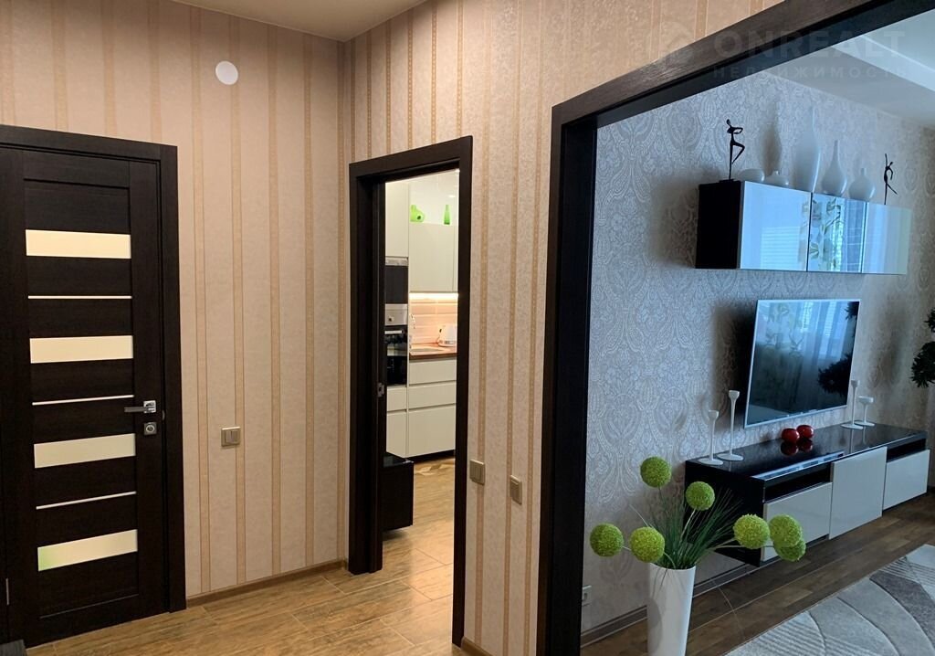 Стены по периметру квартиры отделаны звуко-теплоизоляционным материалом, обои во всех помещениях квартиры – виниловые с фактурным тиснением (Италия). Потолки натяжные (матовой фактуры) с встроенными точечными светодиодными светильниками. В комнате окно стеклопакет, в кухне – витражное остекление во всю ширину помещения. Пол в коридоре и кухне – отделан керамогранитом, в зале – качественный ламинат. Межкомнатные двери МДФ с фактурной ламинацией цвета венге. Сан.узел отделан – кафельной плиткой. Двойная входная дверь.