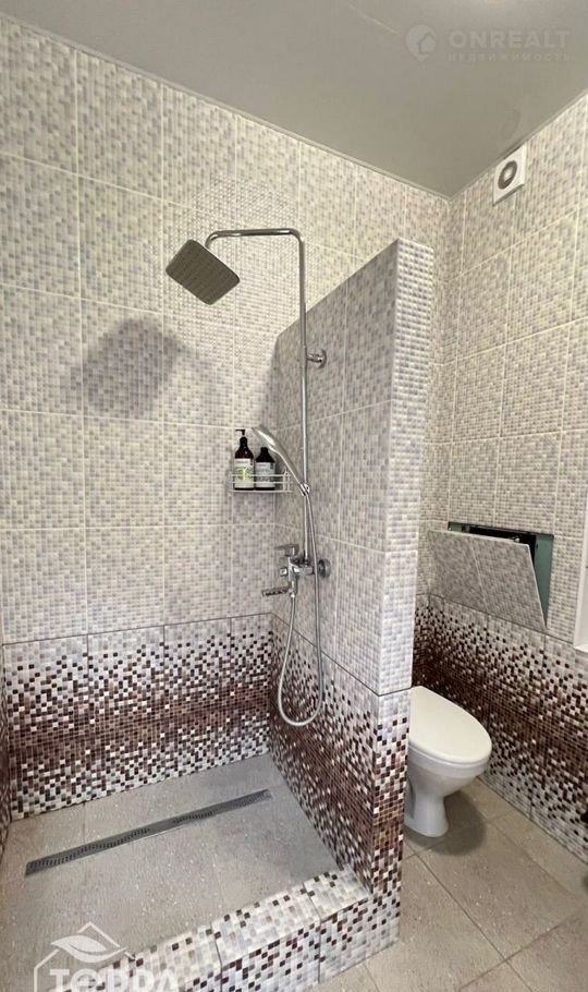 - Дизайн интерьера включает современное решение — натяжной потолок и удобную душевую кабинку.