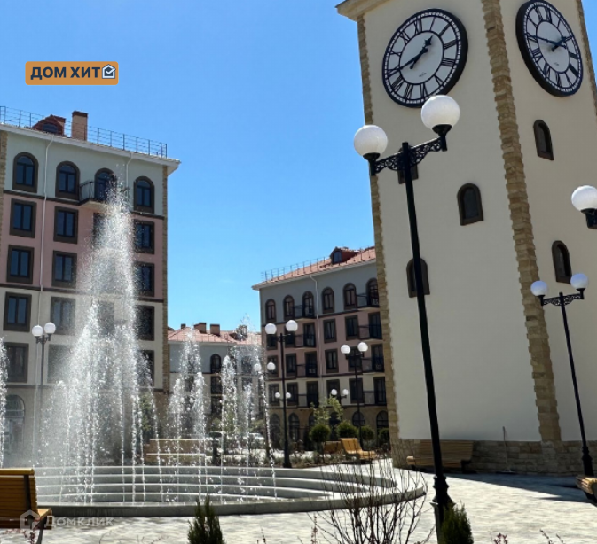- Собственный фонтан и башня с часами, сцена для праздников