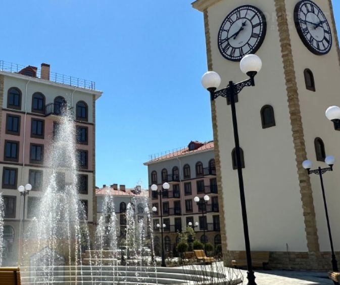 - Собственный фонтан и башня с часами, сцена для праздников