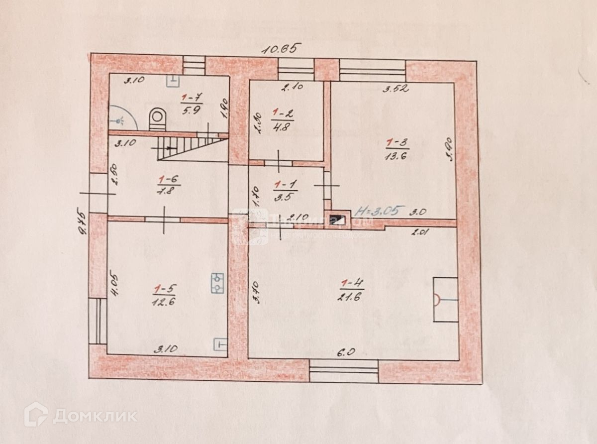 Первый этаж: кухня 12,6 кв.м., гостиная с камином 21,6 кв.м., сан узел 5,9 кв.м., гардеробная комната 4,8 кв.м. и спальня 13,6 кв.м.