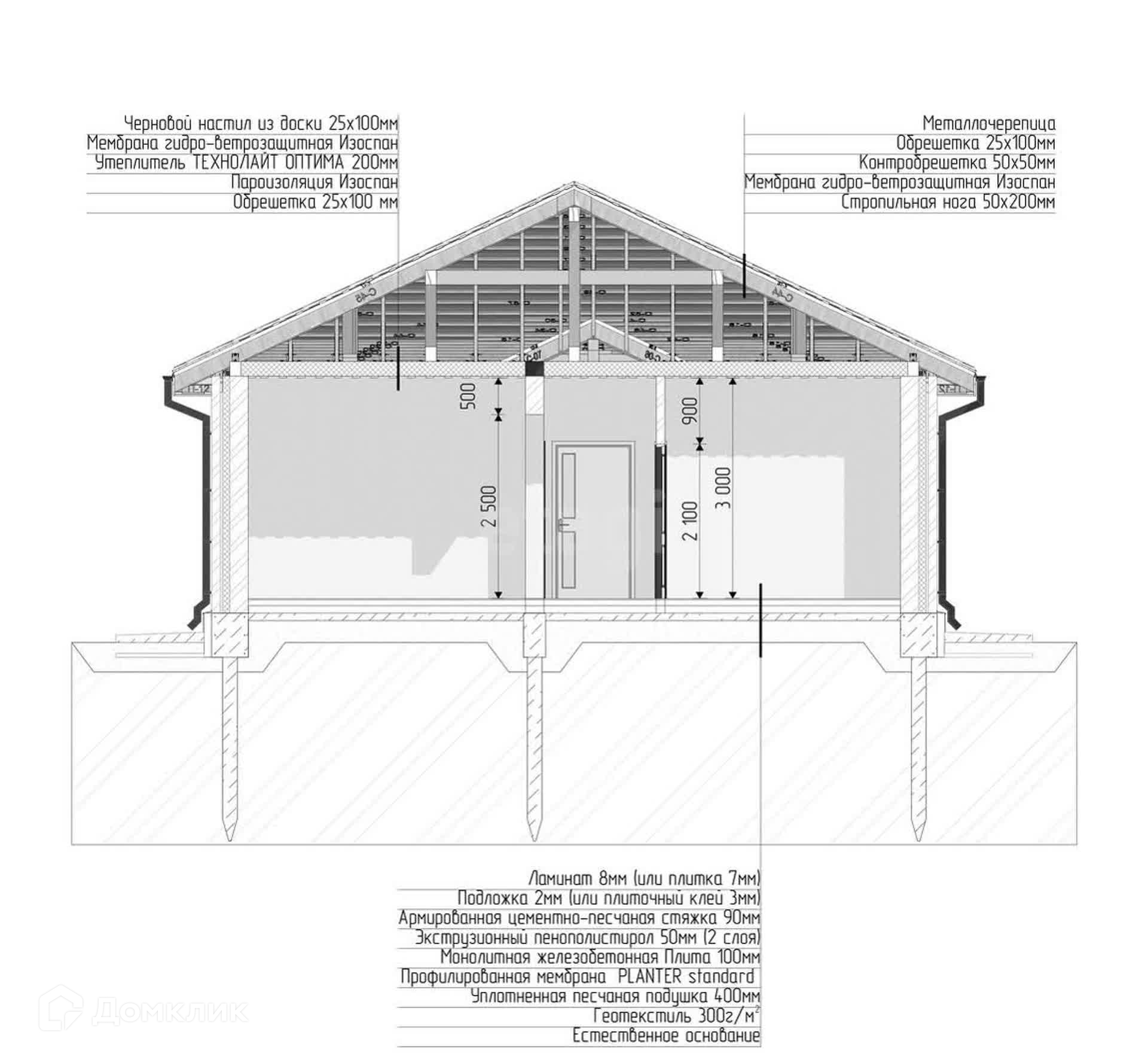 В этом проекте используется ленточно-свайный фундамент, на который установлены плиты перекрытия. Это решение обеспечивает возможность строительства как на ровных участках, так и на участках с уклоном до 60 см.
