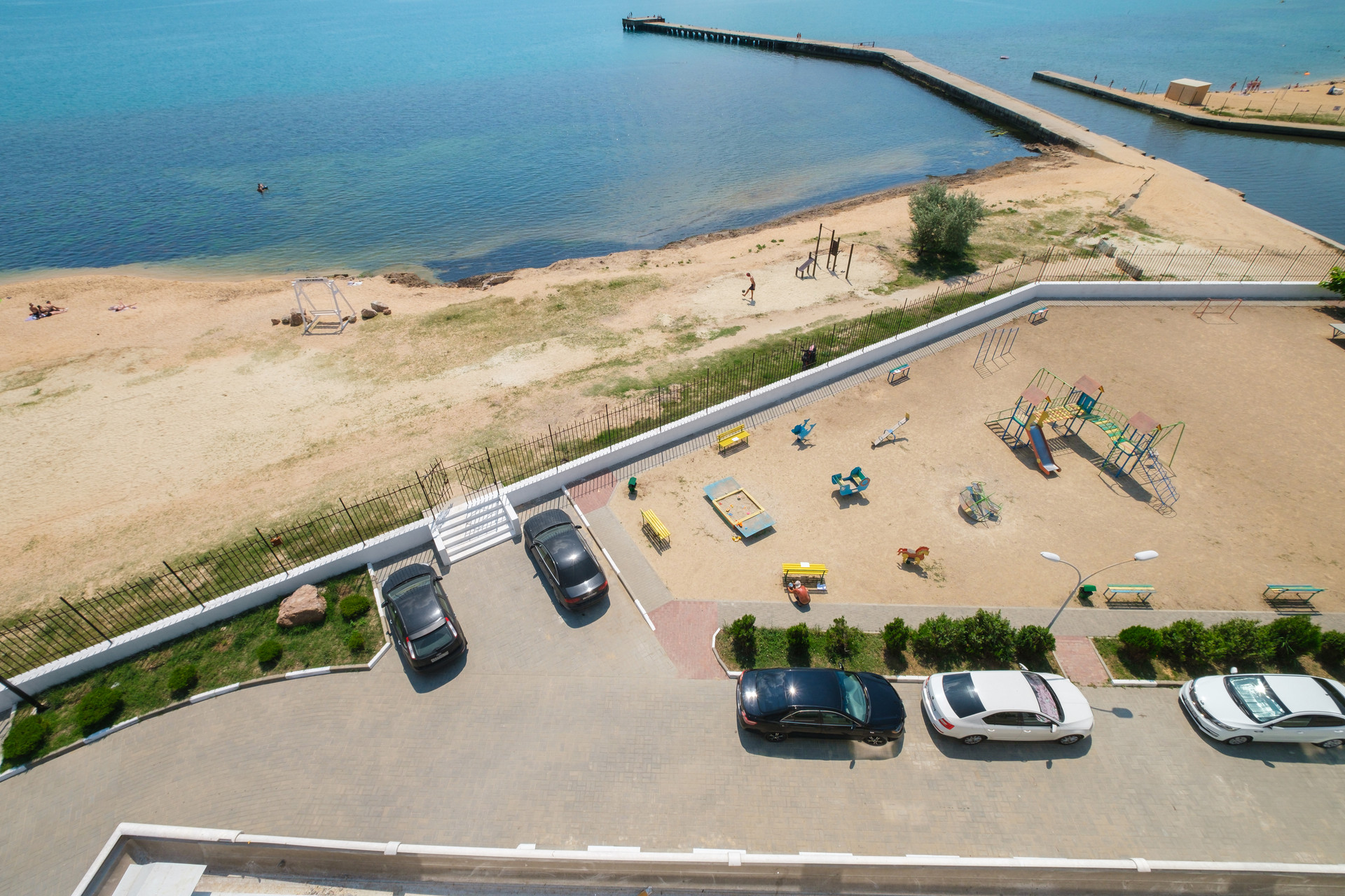 50 метров до песчано-галечного пляжа, с лежаками и зонтиками, кабинками для переодевания и спортивными площадками.