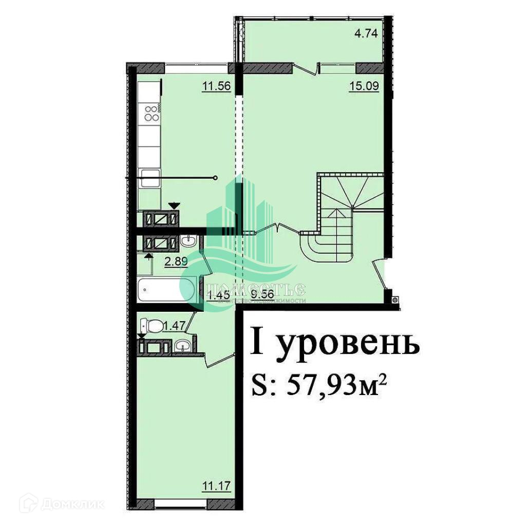 На 1-м уpoвнe находится: кухня-столовая общей площадью 26.6м², ванная комната 2.8м², туалет 1.4м², детская/гостевая комната 11м². Окна выходят во двор и на море.