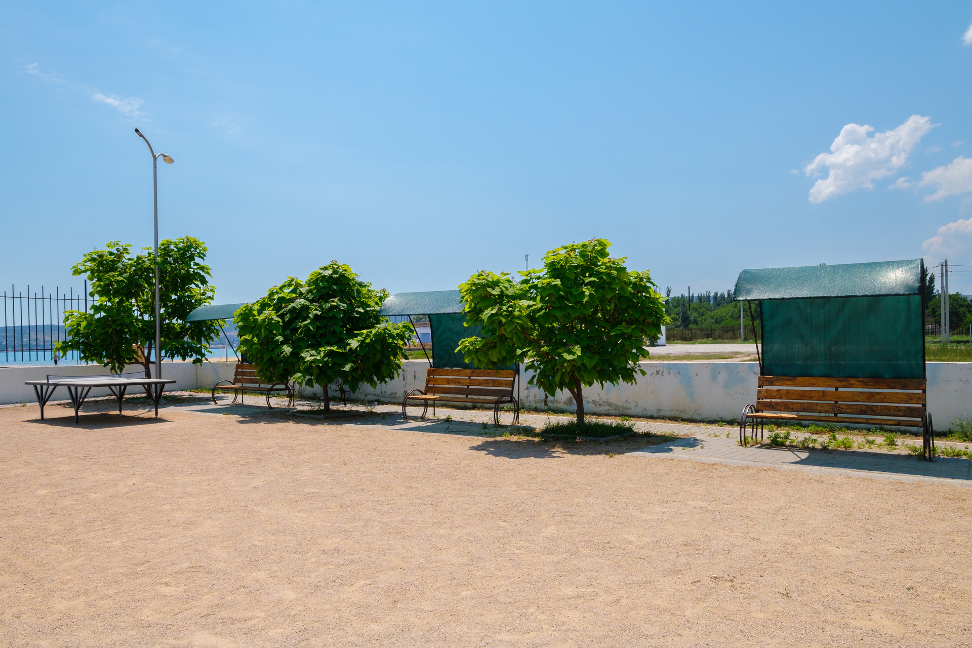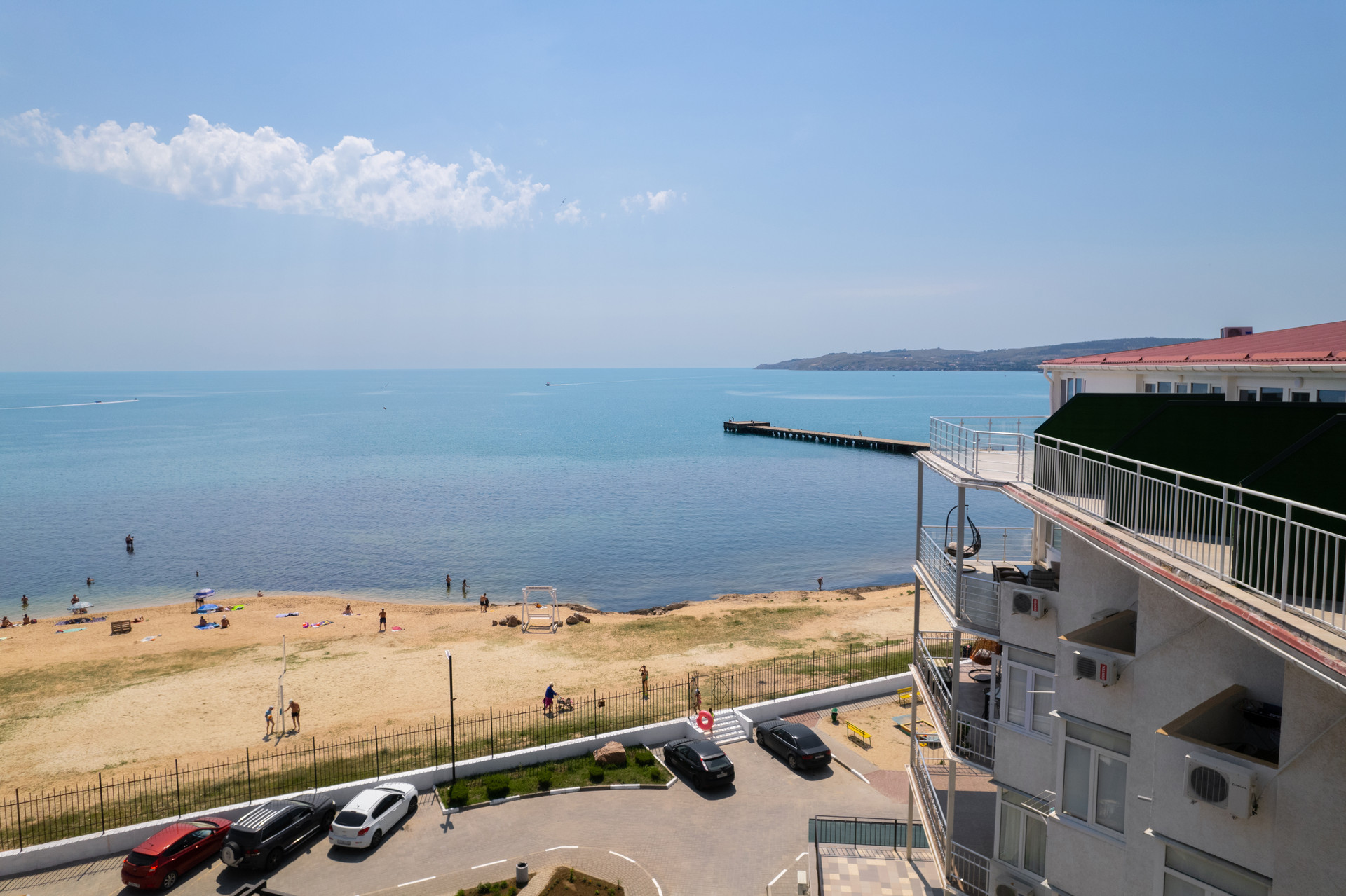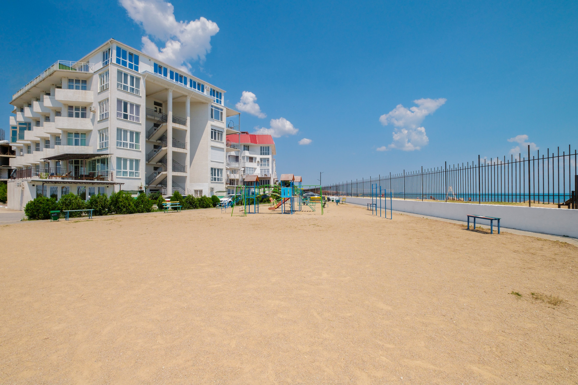 50 метров до песчано-галечного пляжа, с лежаками и зонтиками, кабинками для переодевания и спортивными площадками.