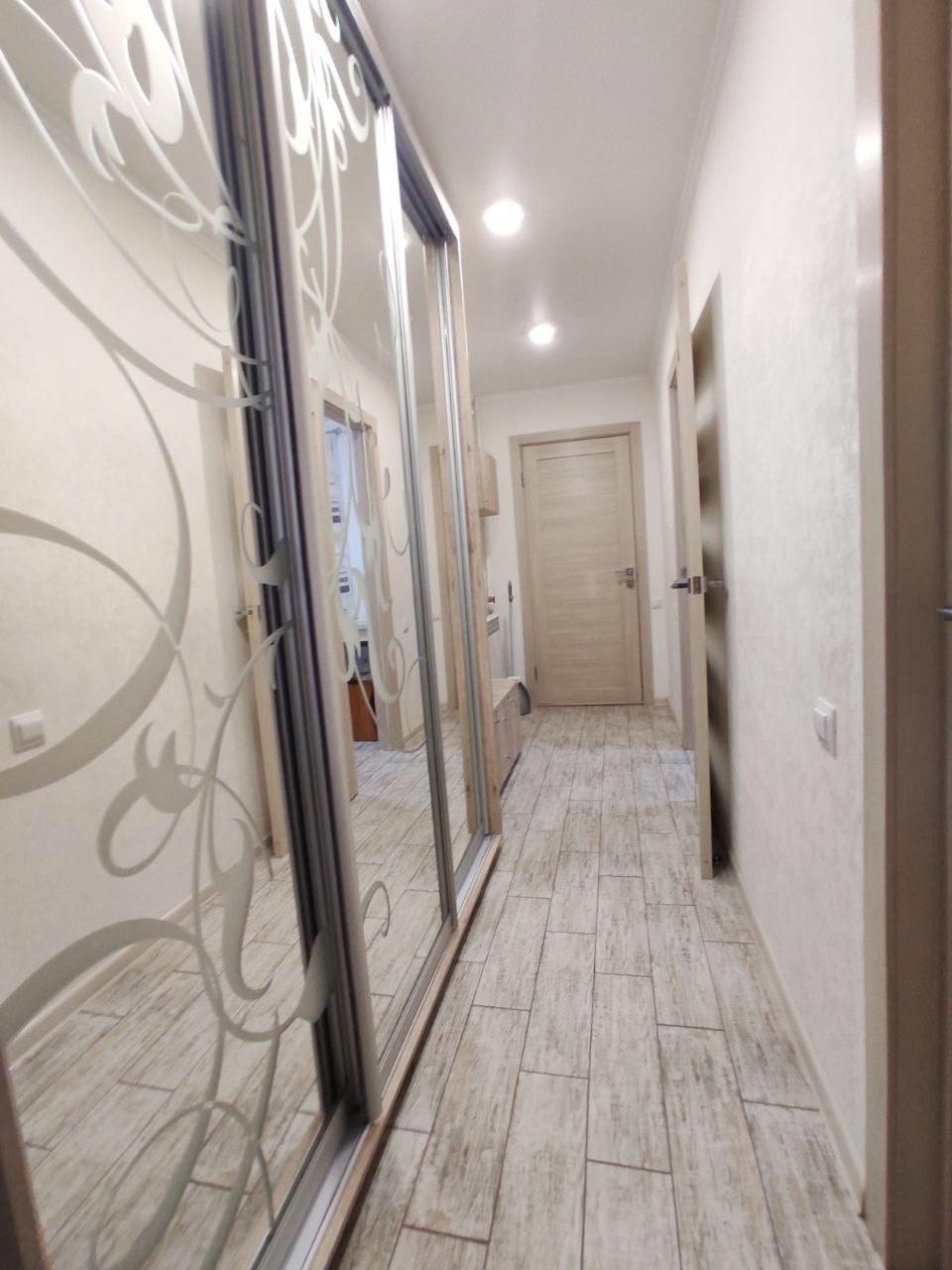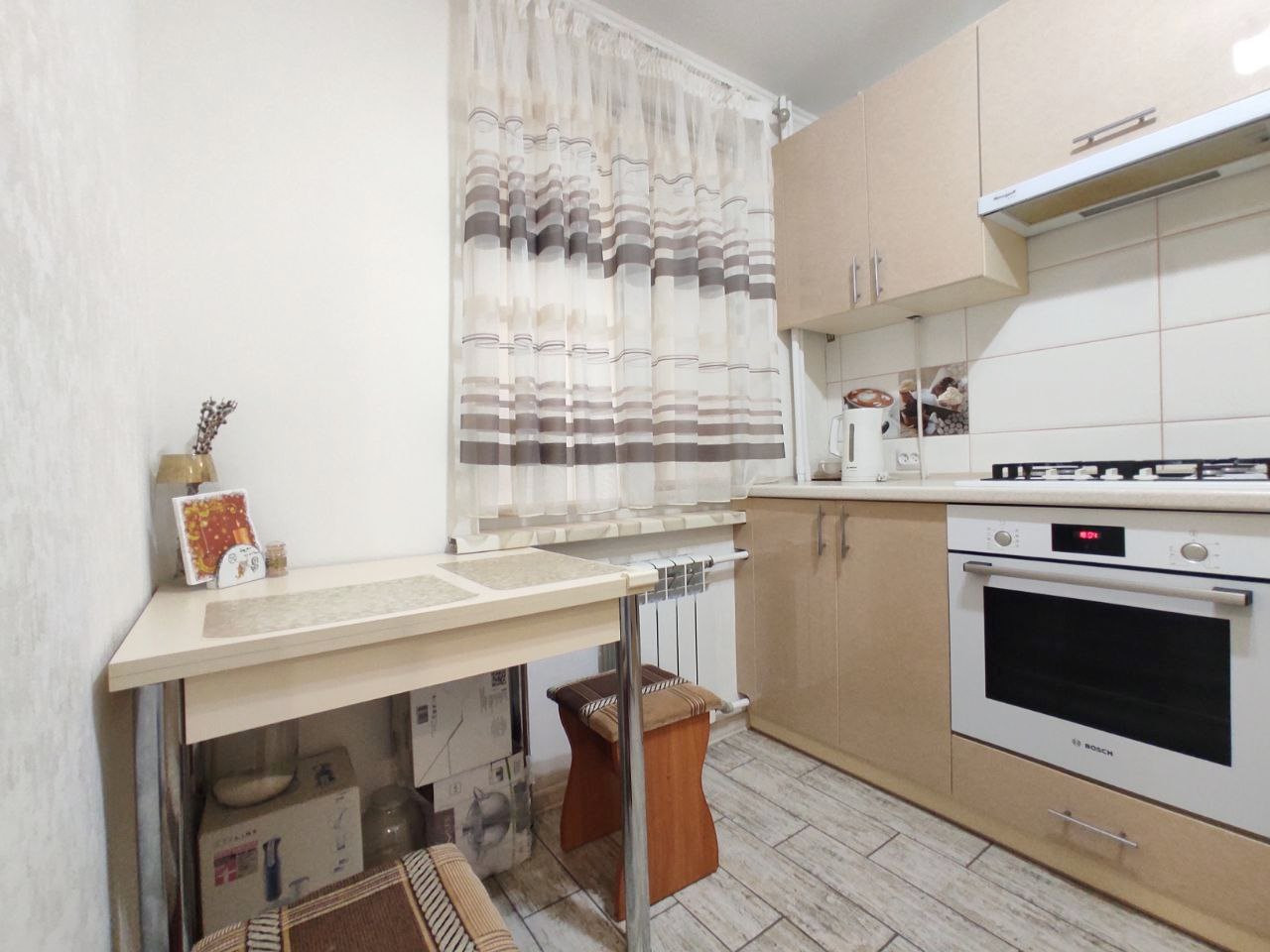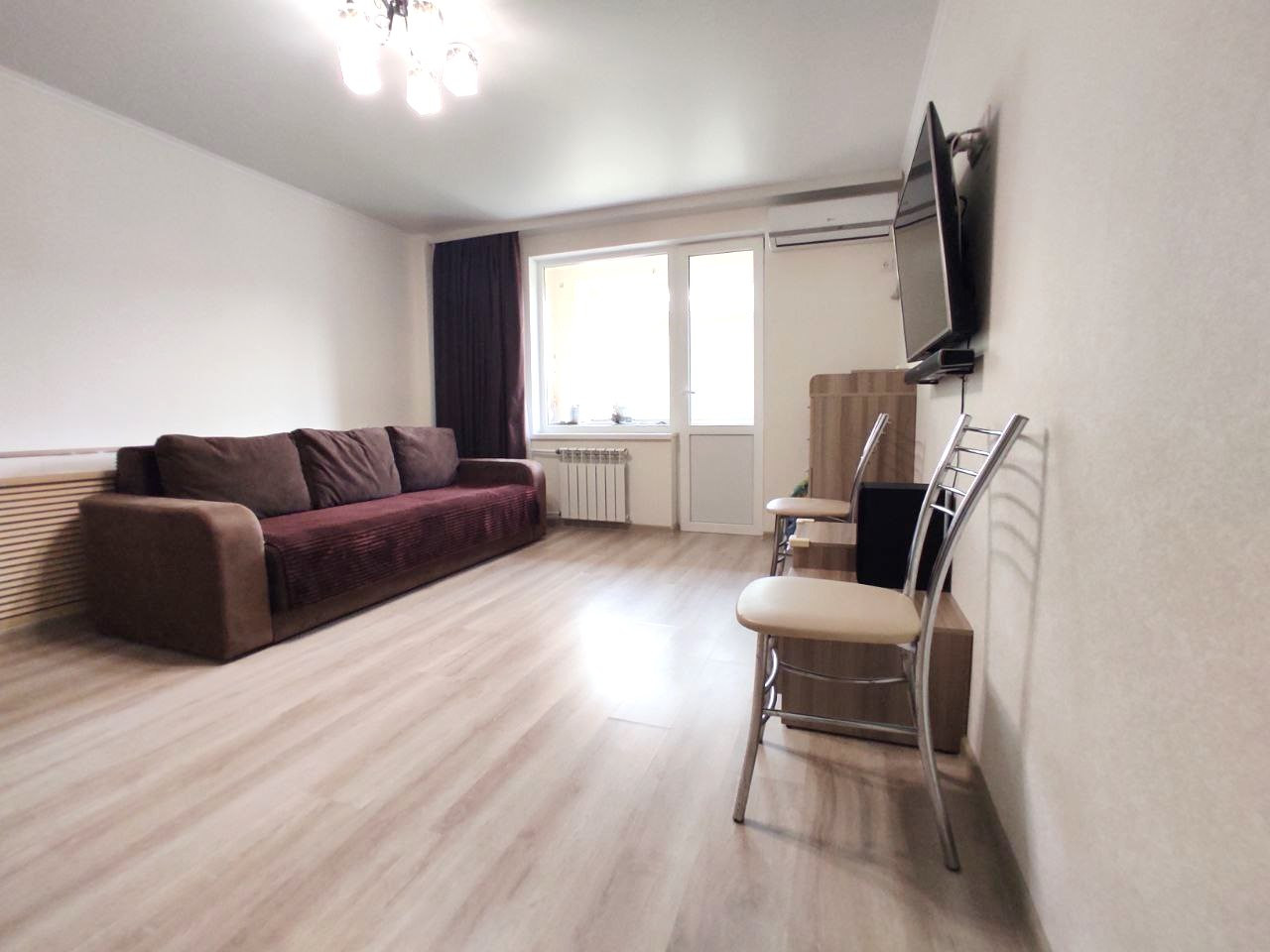 Напольное покрытие в комнате ламинат, на кухне в коридоре и санузле плитка, в санузле установлены теплые полы, все окна металлопластиковые, во всей квартире натяжные потолки.