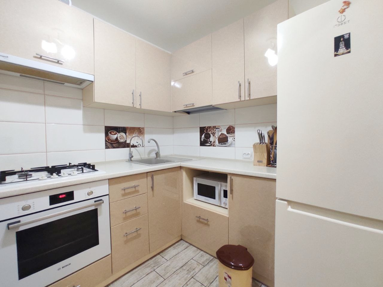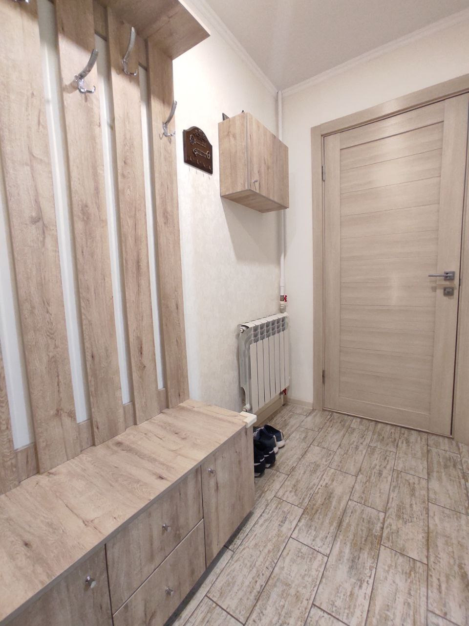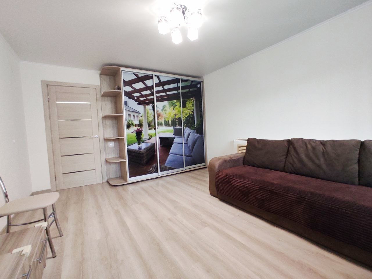 Напольное покрытие в комнате ламинат, на кухне в коридоре и санузле плитка, в санузле установлены теплые полы, все окна металлопластиковые, во всей квартире натяжные потолки.