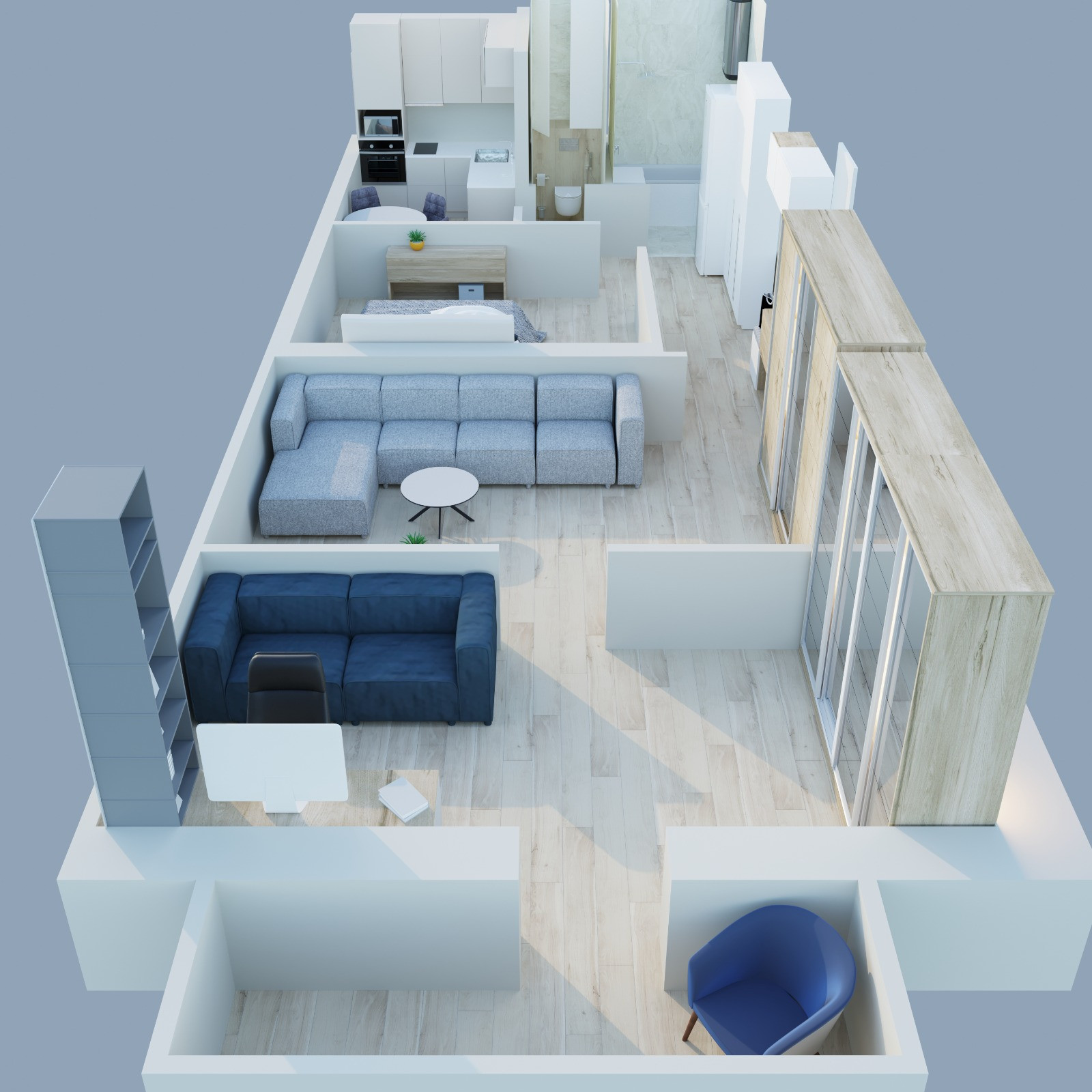 Три окна выходят на юго-запад.