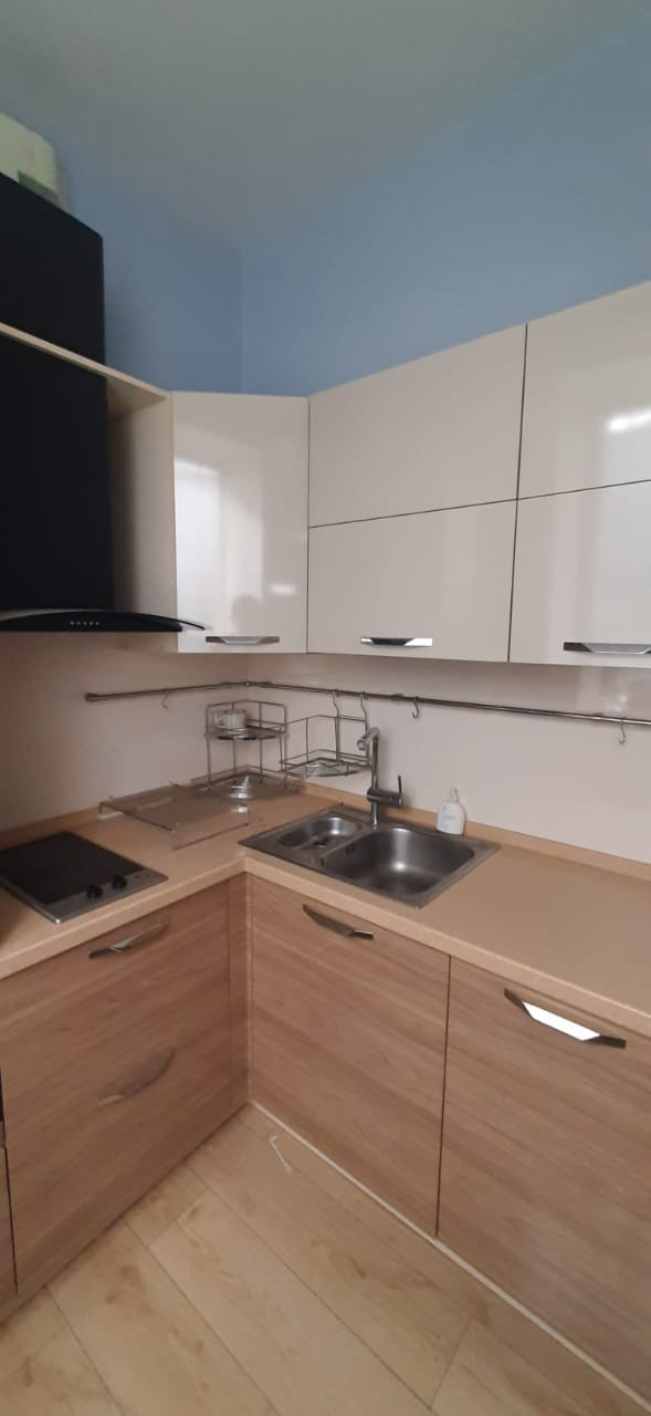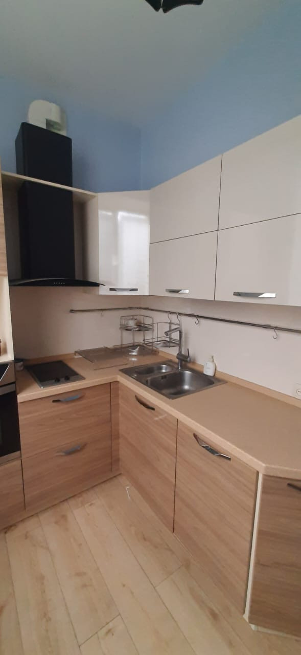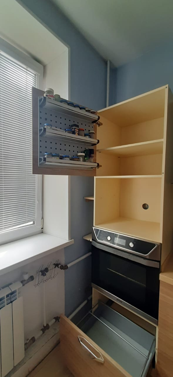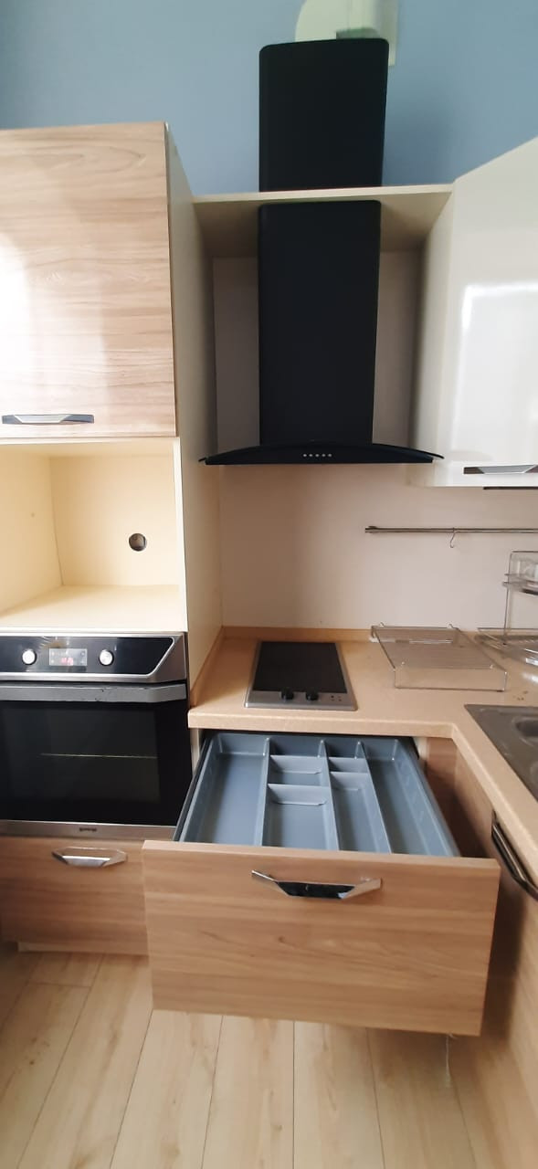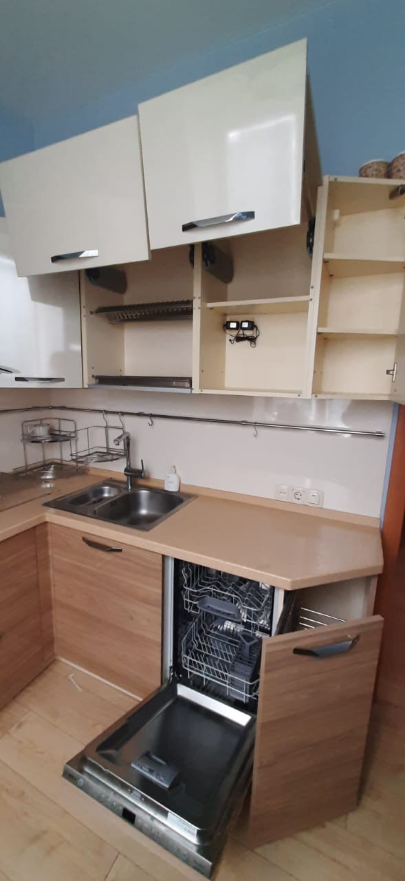 Кухонный гарнитур от мебельной студии Мария, столешница из искусственного камня, фурнитура шкафов и ящиков Bloom. Вытяжка, встроенные духовка, варочная панель стеклокерамическая, посудомоечная машина.