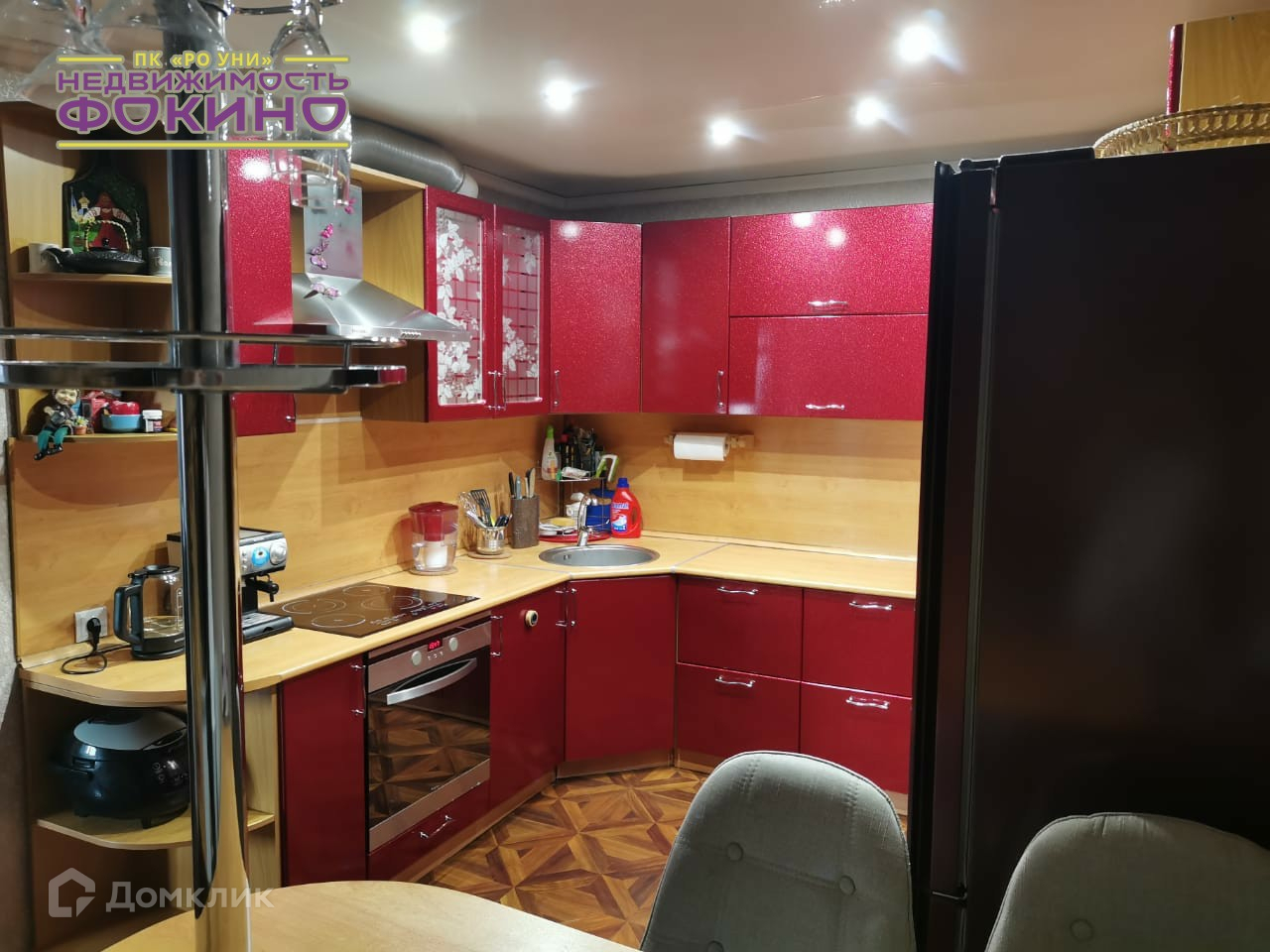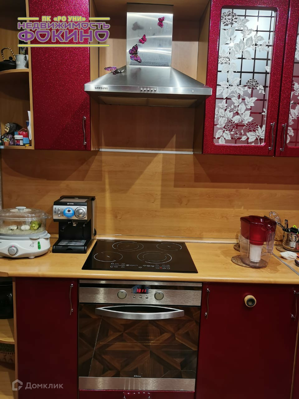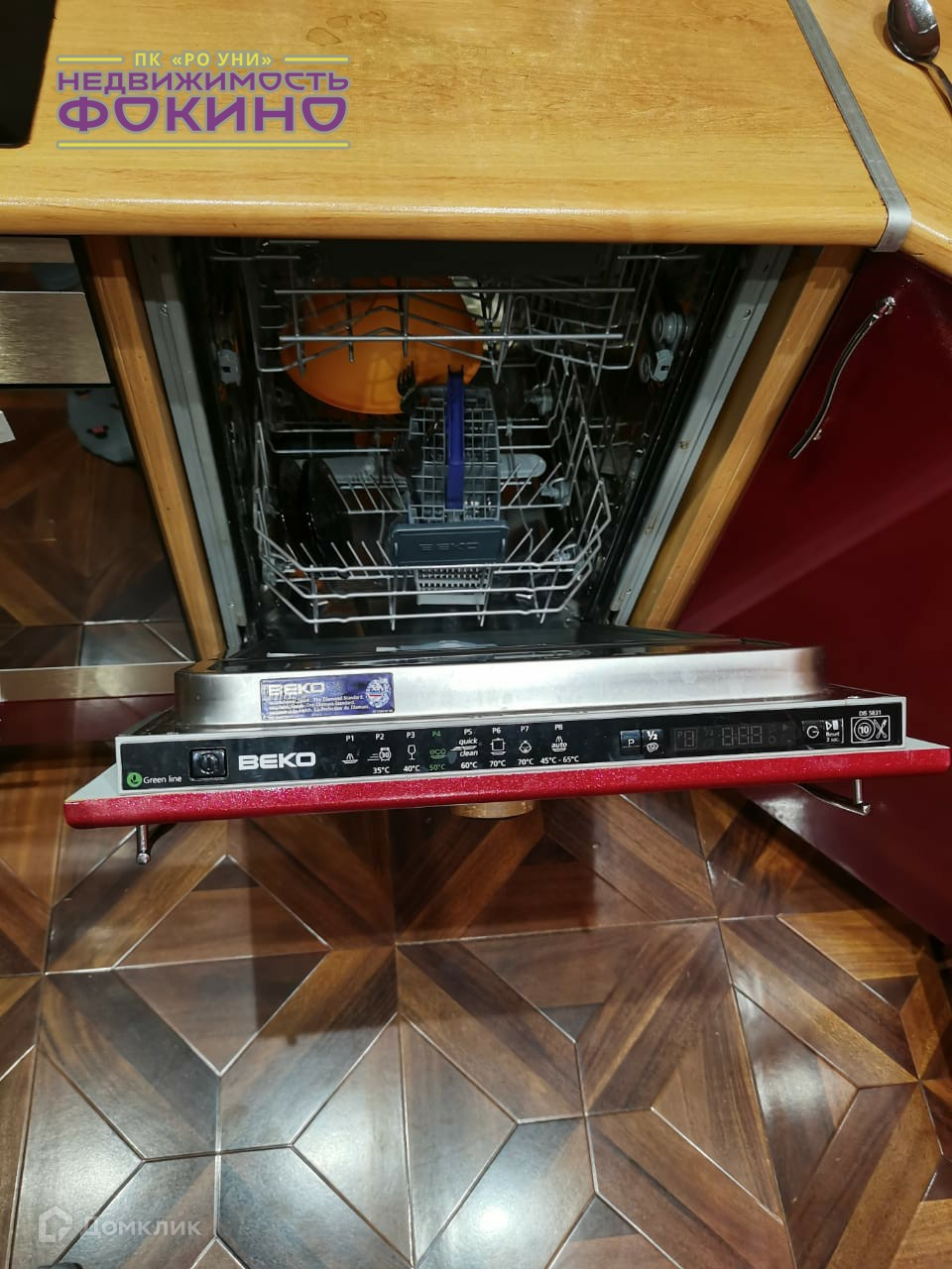 Кухонный гарнитур остаётся со встроенной техникой (посудомоечная, варочная панель).