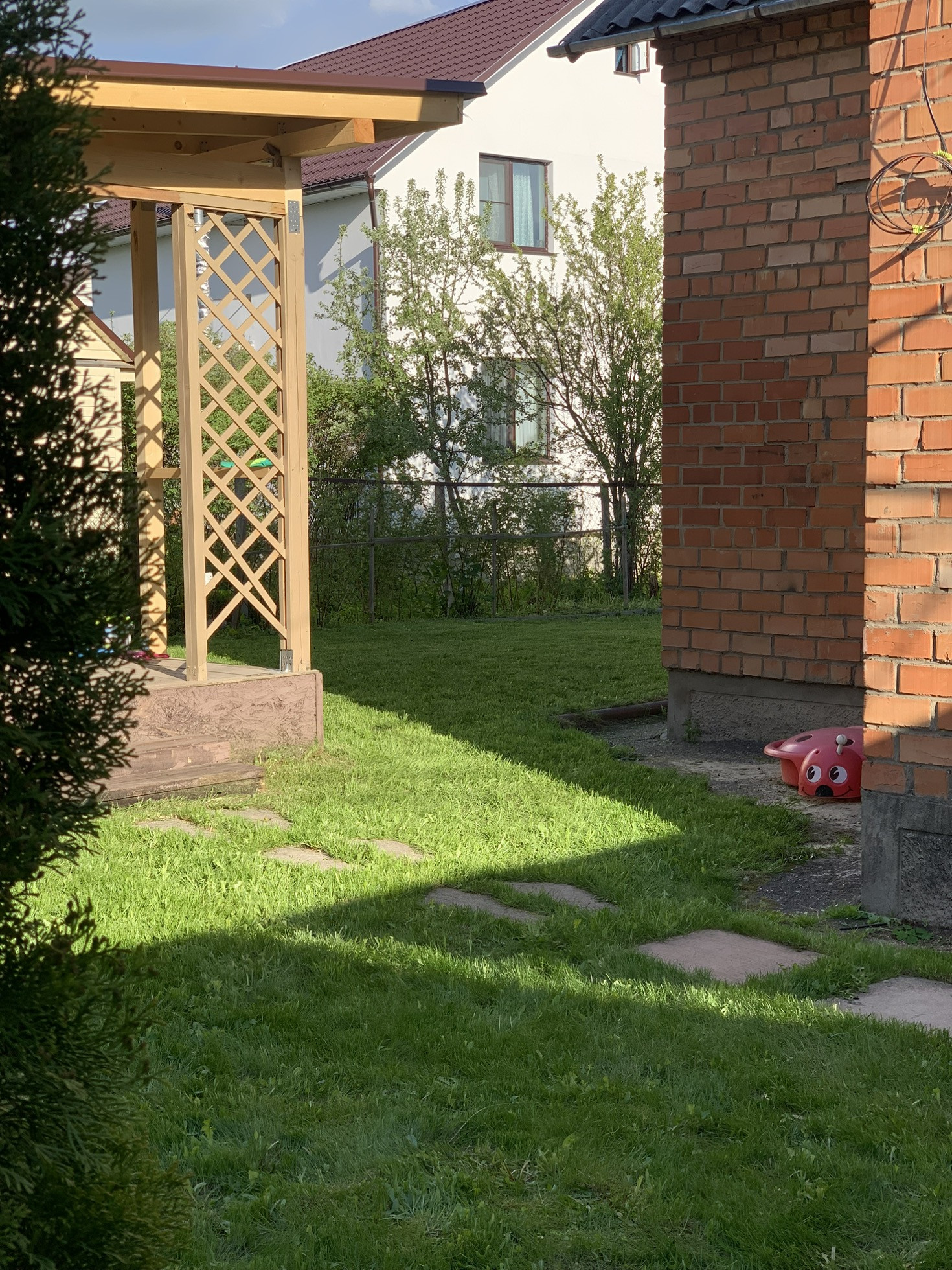 Ухоженная территория участка с современным забором из профнастила.